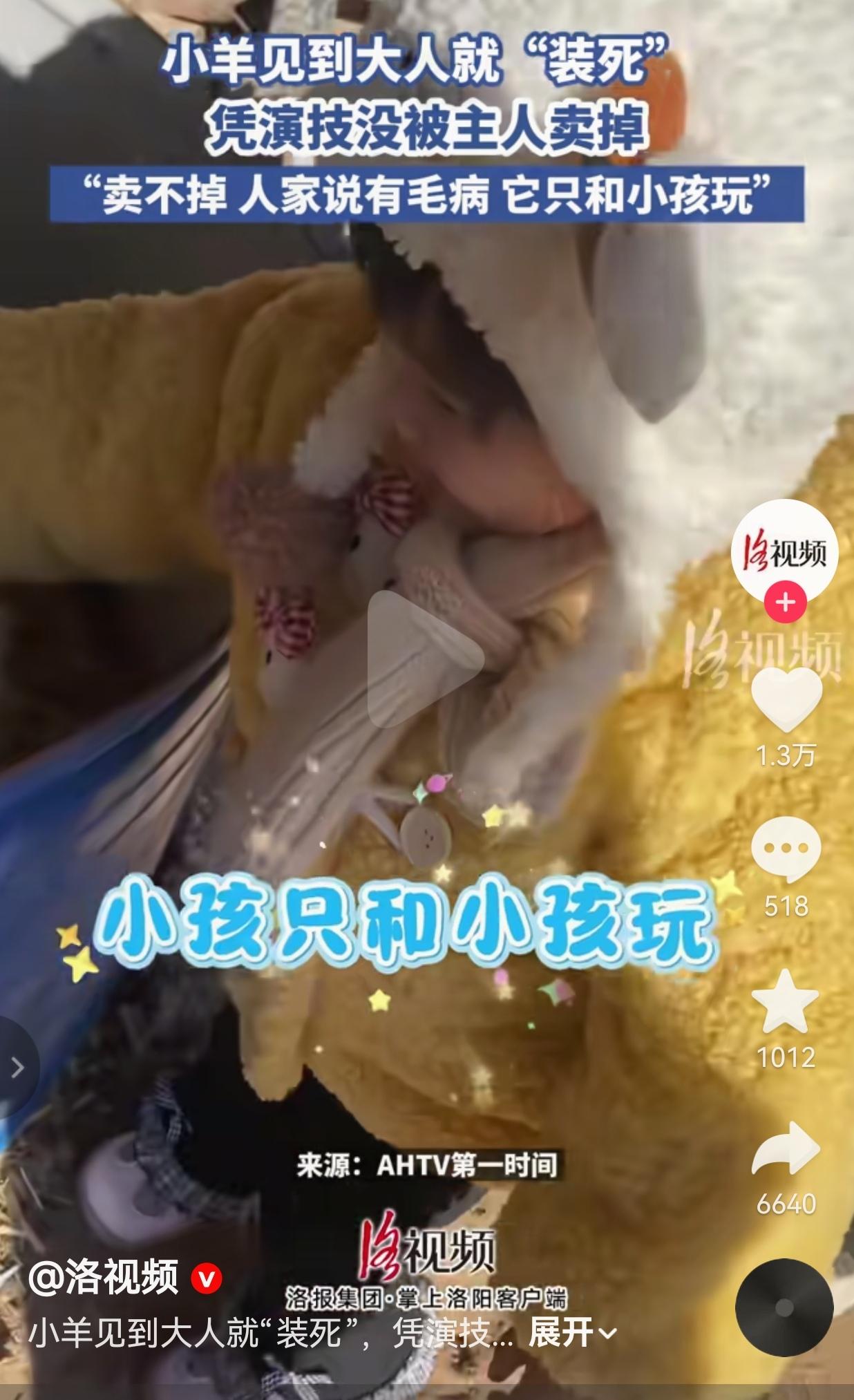这只小羊成精了!近日,宁夏一家养了很多羊,他原本想把小羊拉到集市上卖掉,可这小家伙像是知道自己的命运似的。 只见这只小羊,一看到大人向它靠近,它就立马往草堆里一躺,四脚朝天一动不动,活脱脱一副“没气了”的模样。 买主一看这架势,都以为小羊有毛病,没人愿意买,最后主人只能把它又拉回了家。 后来主人才发现,这哪里是有毛病,分明是小羊故意为之。 为什么呢?因为这只小羊被拉回家之后,主人看见它跟小孩玩的很活泼,也很撒欢。那反差萌直接拉满。 网友调侃:“这羊怕不是偷偷上了表演课,演技比某些演员都好!” 还有的网友说:“这只小羊不一般呀!太聪明了,它知道小孩对它构不成伤害,所以,它跟孩子玩的很开心。 小孩为什么更容易跟小动物走得亲近?说到底,还是因为孩子的世界很简单,喜欢就是喜欢,没有那么多弯弯绕绕。 他们不会想着这东西到底值多少钱,他们只是看到喜欢的东西,单纯地想跟你玩。 小羊装死,说白了,就是为了保护自己。小孩靠近,是因为没有伤害。大人被防备,是因为带着“买卖”的味道。