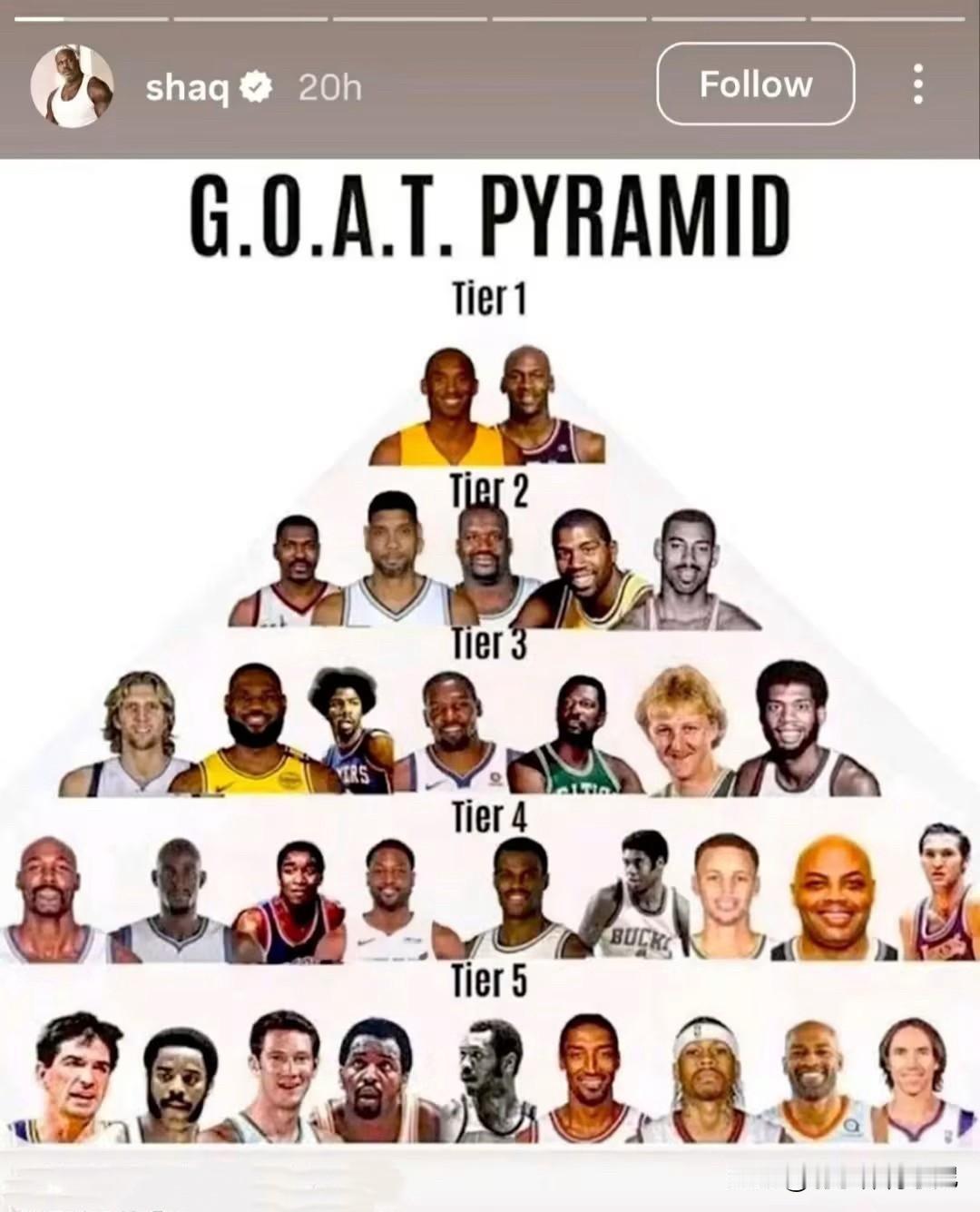 奧尼尔社媒发推,晒出联盟历史GOAT分级: 1、乔科第一级; 2、大梦、邓肯、奧尼尔、魔术师、张伯伦第二级; 3、诺维斯基、詹姆斯、杜兰特、大鸟等第三级; 4、马龙、库里、巴克利等第四级; 5、斯托克顿、皮篷、艾弗森等第五级。 这个排级非常接近现实的真实实力了,除了库里,库里该排第三级。[吃瓜群众][吃瓜群众]