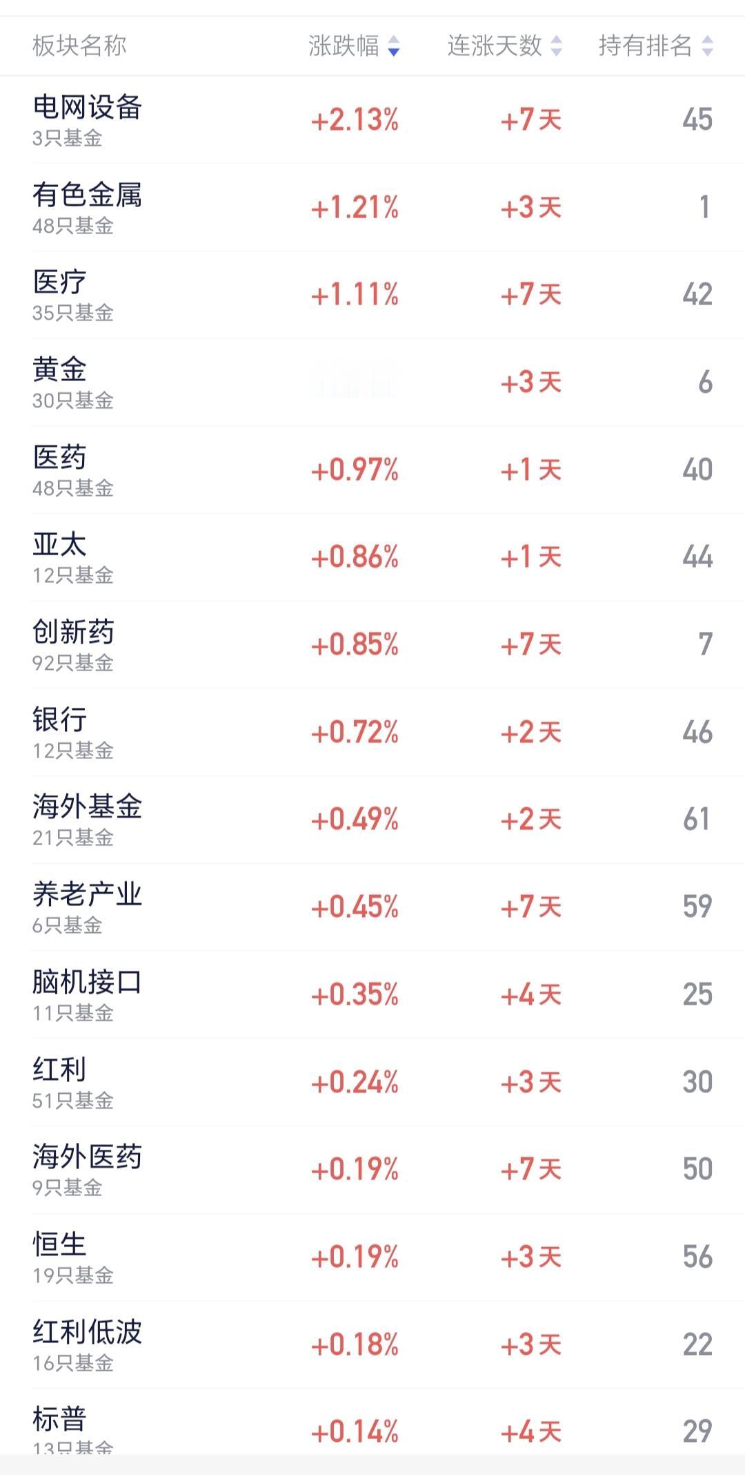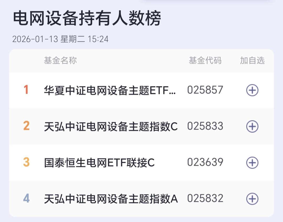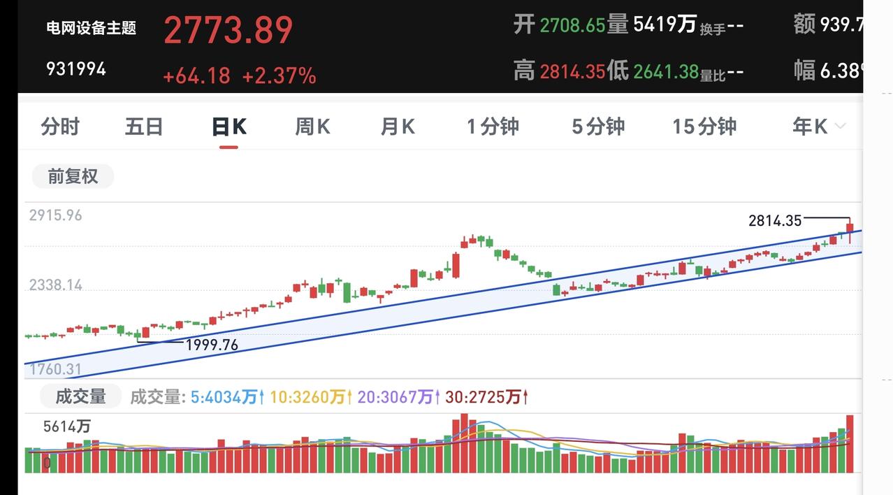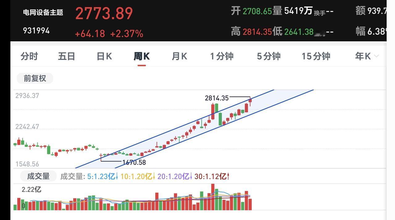 基金:电网设备板块应该怎么办 今天上涨幅度最大的三个板块是:电网设备板块,有色金属板块,医疗板块,电网设备板块连续上涨了7个交易日,持有人数在所有板块中排名第45位,今天上涨了2.13%,今天的加仓排行榜见下面的截图3,持有人数排行榜见下面的截图4,排名第一的都是华夏中证电网设备。 我们来看一下下面的截图5,这是电网设备板块日K线图,从图中可以看出,我画了两条倾斜向上的斜线,这是电网设备板块日线级别上涨通道,今天的上涨突破了这个上涨通道的上轨,也就是说,这个板块日线级别有可能会走加速走势。 我们来看一下下面的截图6,这是电网设备板块周K线图,从图中可以看出,我画了两条倾斜向上的斜线,这是电网设备板块周线级别上涨通道,今天盘中一度突破了这个上涨通道的上轨,但收盘的时候又回到了这个上涨通道上轨的附近,近期观察是突破这条上轨线,还是遇阻回落,持有的人可以继续持有,除非跌破这个上涨通道的下轨,才可以考虑要不要止盈出来观望。 我每天都会分享我的观点,我的观点只代表我个人的看法,不能作为你操作的依据,据此操作后果自负。