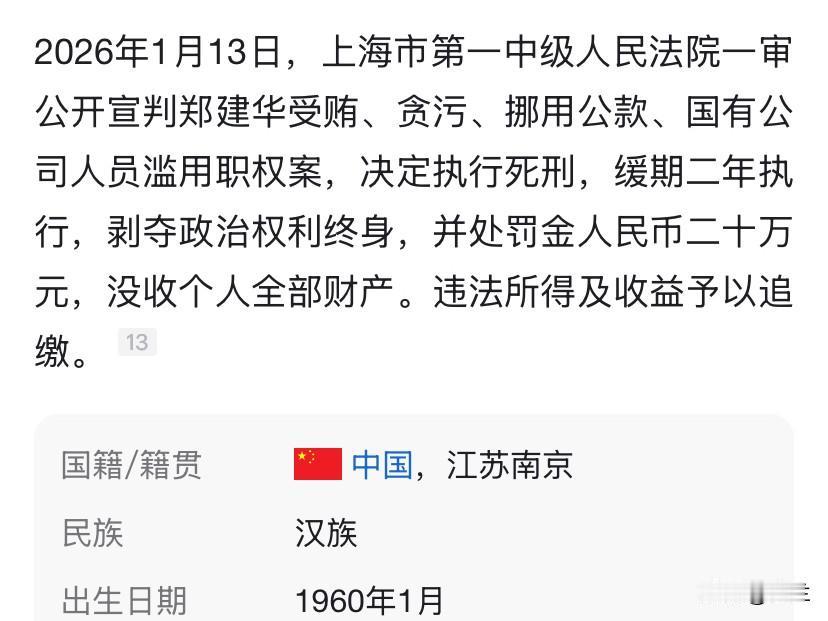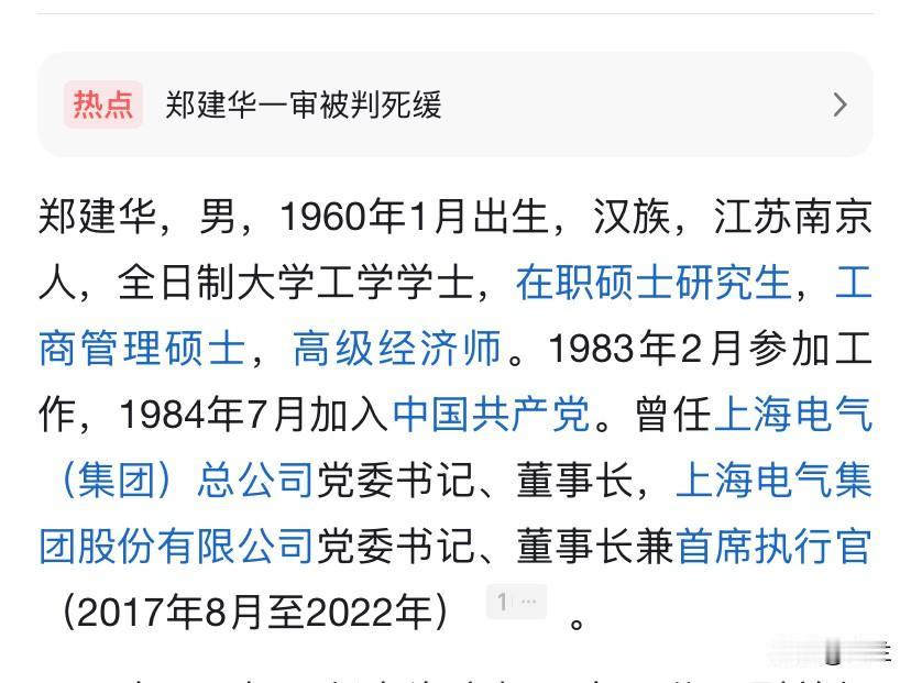 上海的郑建华上了热搜!他是江苏省南京市人,有着高级经济师职称,他长期在上海的国企工作,曾在上海电机厂有限公司、上海汽轮发电机有限公司、上海汽轮发电机有限公司、上海电气集团上海电机厂、上海汽轮发电机有限公司、上海电气电站集团等公司工作过。 2017年他同时任上海电气(集团)总公司、上海电气集团股份有限公司的董事长,一直到2021年。 他工作了三十多年,到退休的时候本有着很高的退休金,可惜他没有坚守初心,在岗位上不好好的工作,如今他要为自己过往的行为买单,60多岁了都还在要在里面待着!