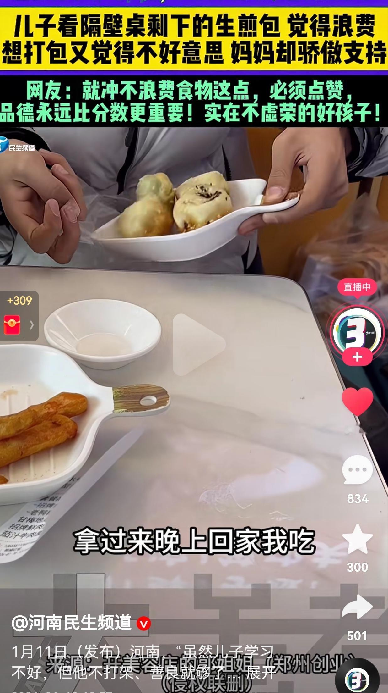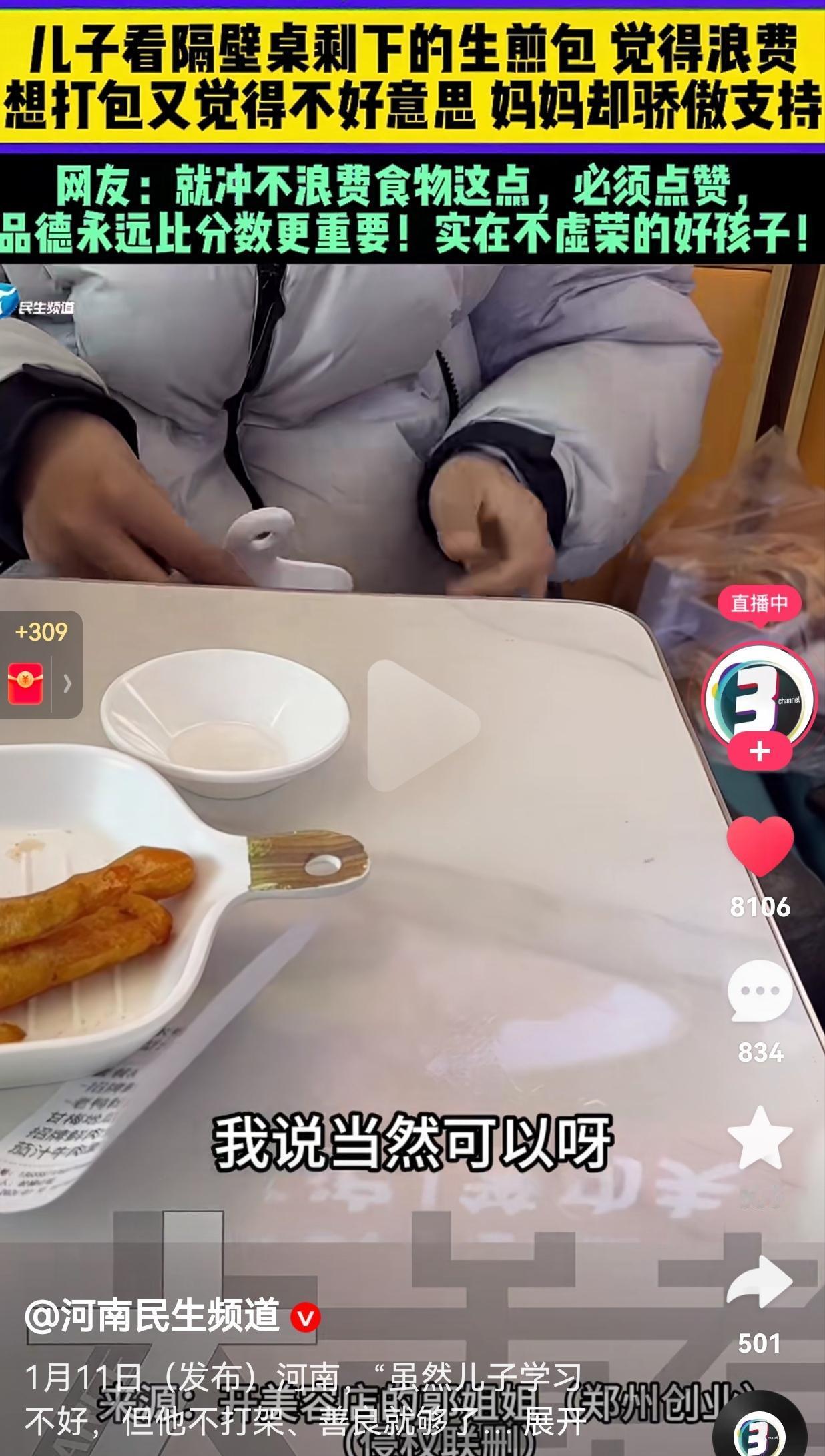 这孩子长大才有出息!1月11日,河南一位妈妈带儿子在外吃饭,男孩吃着吃着,抬头一看,一眼瞧见隔壁桌的盘子里还剩两个生煎包,而且,旁边的顾客已经离开了。 他害怕浪费了这么好的食物,就小声跟妈妈说:“看着浪费,咱拿过来吧,晚上回家我吃。” 妈妈没有丝毫犹豫,笑着回应儿子:“当然可以呀!” 妈妈看到孩子这么节约,还特意拿起了手机,把这暖心的一幕记录了下来。 男孩本来还没有觉得不好意思,当镜头对准他的时候,他竟然还有一丝害羞。 而妈妈一边帮着儿子把生煎包装进塑料袋,一边说出自己的心声,她说:“我觉得我的儿子虽然学习不好,但除了学习,其他都挺好的。他不打架、善良,和同学玩得也很开心就够了,我只盼他平安长大。” 此事传到了网上,有网友看到后评论道:“就冲不浪费食物这点,必须点赞。” 还有的网友说:“成绩好不好不重要,品德必须要好,因为品德永远比分数更重要。” 是啊,一个懂得珍惜食物、心怀善意的孩子,就算成绩不是特别好,未来也绝不会差。 而这位妈妈的做法,更值得所有家长学习与反思。她没有指责孩子丢人,也没有用学习不好否定孩子的优点,反而用一句善良就够了给了孩子最温暖的肯定。 虽然说分数很重要,但是,相对于品德来说,分数就显得没有那么重要了,而且,分数也不能决定孩子的未来。 最后,希望我们都能放下对分数的执念,善于发现孩子身上的优点,扬长避短,孩子以后也能成长为一颗参天大树。