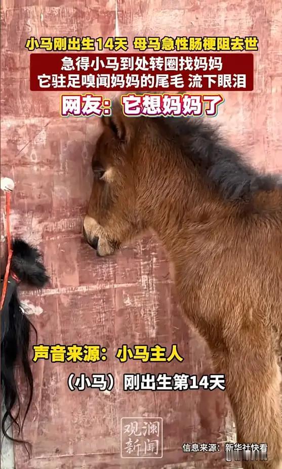 万物有灵!四川14天幼马守着母马尾毛垂泪,这一幕看哭无数人 都说母子连心,这份羁绊哪会只存在于人类之间?1月12日四川的一个马棚里,一幕揪心画面让无数人为之动容。刚出生仅仅14天的小马驹,正孤零零地守在墙角,鼻尖蹭着一缕悬挂的尾毛,眼眶里滚出的泪珠,一滴接一滴砸在地上。 谁能想到,就在不久前,这只小马驹还依偎在母马怀里吃奶。天有不测风云,母马产后突发急性肠梗阻,拼尽全力也没能熬过这一关,匆匆撇下尚未断奶的孩子。没了妈妈的身影,没了熟悉的体温,小马驹像丢了魂一般,在马棚里漫无目的地打转。它时不时昂起头发出细碎的呜咽,一声声都像在呼唤母亲,那模样任谁看了都忍不住心头一酸。 主人实在不忍心看它日渐萎靡,思来想去,剪下母马生前的一缕尾毛,轻轻挂在了马棚的墙角。他满心期许,这缕带着母马气息的尾毛,能稍稍慰藉幼马的思念。没想到,奇迹真的发生了。小马驹循着熟悉的味道凑了过来,鼻尖反复摩挲着尾毛,一双澄澈的眼睛里慢慢蓄满泪水,豆大的泪珠滚落下来,它就那么静静站着,凝视着那缕尾毛,仿佛透过它看到了母亲的身影。 动物的感情从来都纯粹得让人心颤,尤其是尚在襁褓中的幼崽,母亲就是它们的全世界。母亲骤然离世,对它们而言无疑是灭顶之灾。网友们看到这一幕纷纷感慨,这么小的孩子,本该在妈妈的庇护下撒娇长大,命运却如此残酷。只愿这只小马驹能带着母亲的念想,健健康康地长大,往后的日子,平安顺遂。 每一个生命都值得被温柔以待,这份跨越物种的母子深情,也在提醒着我们,要常怀敬畏之心,善待身边的每一个生灵。