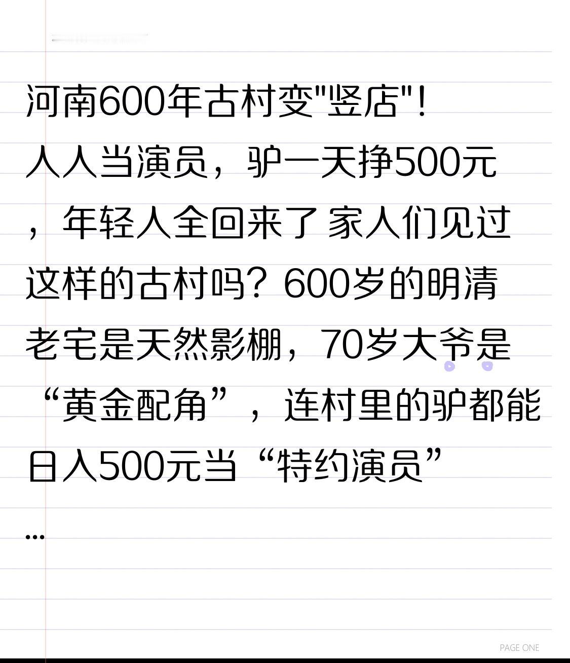 河南600年古村变"竖店"!人人当演员,驴一天挣500元,年轻人全回来了 家人们见过这样的古村吗?600岁的明清老宅是天然影棚,70岁大爷是“黄金配角”,连村里的驴都能日入500元当“特约演员”!河南登封袁桥村,这个曾冷冷清清的“露天历史博物馆”,如今人人拍剧、户户增收,硬生生把自己活成了“乡村横店”,这反转也太绝了! 谁能想到,三年前的袁桥村还是另一番模样。青瓦老墙虽有韵味,可游客来了拍几张照就走,带不来多少收入。年轻人嫌村里没机会,纷纷外出打工,留守的老人守着老屋和田地,古戏楼前再也没了往日热闹。村支书急得睡不着觉:守着金饭碗,咋就富不起来? 转机来得特别巧!前年夏天,有微短剧剧组偶然进村取景,导演一眼就相中了这里的原生态风貌——明代碉楼、三进四合院、斑驳巷道,不用搭景就是现成的古装片场 。一开始村民只是围观看热闹,直到有剧组缺群演,74岁的袁铁芳大爷领着十几个老伙计主动请缨:“你瞅俺们中不中?”没想到,这些一辈子没上过镜的庄稼人,往古戏楼前一站,本色出演反倒格外真实。 这无心之举竟成了爆款密码!首部微短剧《功成名就时,衣锦还乡日》全网播放量破3000万,袁桥村彻底火了 。从此剧组踏破门槛,40多部短剧接连在这里开机,村民们也从“围观者”变成了“剧中人”。农忙时种地,农闲时拍戏,大爷大妈演起乡邻、掌柜有模有样,一天能挣百十来块;手艺人安青娥的编花篮手艺被拍进戏里,订单从全国各地飞来;连村里的驴、鸡、羊都成了抢手货,温顺的驴因为能拉车、营造乡土氛围,日片酬高达500元,比不少上班族工资还高。 变化最让人暖心的,是年轻人回来了。以前村里冷清得只剩老人孩子,现在外出打工的年轻人纷纷返乡,有的当场务,有的做剪辑,有的开起农家乐。“在家门口既能挣钱,又能照顾老人孩子,比在外漂泊强多了”,一位返乡青年的话道出了大家的心声。如今的袁桥村,旺季时1200人的就餐容量、200多个住宿床位全满,2025年村集体收入快400万元,其中近两成来自微短剧相关产业 。 更难得的是,村子火了却没丢根。古建筑修复坚持“修旧如旧”,剧组拍摄不破坏原貌,政府还把剪辑、场务培训班办到村里,培育本地人才。接下来,村里还要打造18类特色拍摄场景,建微短剧孵化基地,让游客也能体验角色扮演 。 从冷清古村到“乡村竖店”,袁桥村的逆袭告诉我们:乡村的宝藏从不是尘封的老物件,而是能与时代同频的创造力。当古老砖瓦遇上现代镜头,当乡土烟火融入影视故事,乡村振兴就有了最生动的模样。 这样的“全民演戏”的古村,你想来看看吗?评论区聊聊~