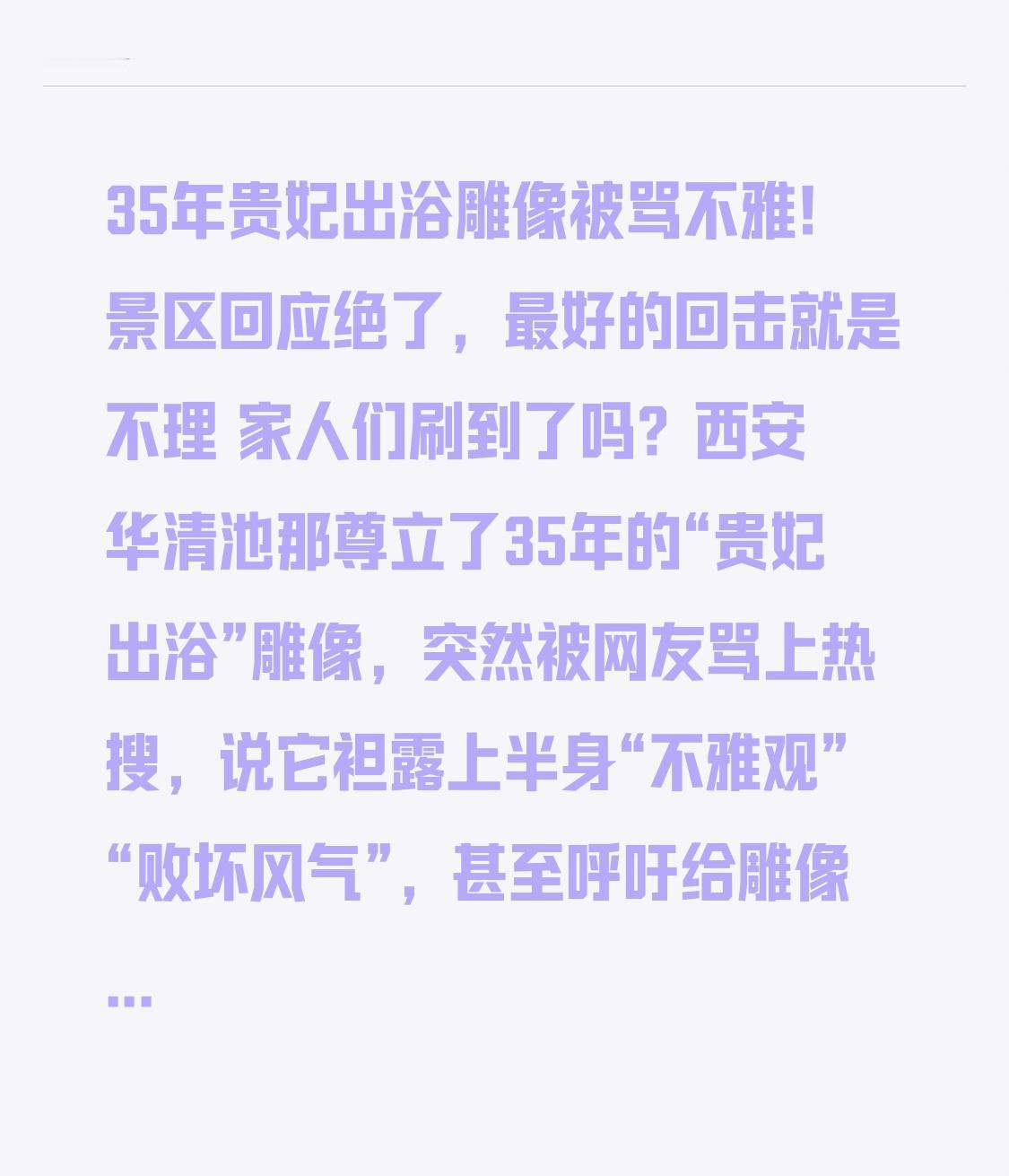 35年贵妃出浴雕像被骂不雅!景区回应绝了,最好的回击就是不理 家人们刷到了吗?西安华清池那尊立了35年的“贵妃出浴”雕像,突然被网友骂上热搜,说它袒露上半身“不雅观”“败坏风气”,甚至呼吁给雕像“穿件衣服”!可景区的回应却让无数人点赞,这事儿的反转,远比你想的更值得深思! 谁能想到,这尊安安静静伫立了三十多年的雕像,会突然陷入舆论漩涡。发帖网友晒出雕像照片,吐槽“杨贵妃作为历史名人,衣不蔽体太难看”,还担心会带坏孩子。帖子一出,立马引发两极争论:有人跟着附和“公共场合这样确实不妥”,但更多网友直接反驳:“白居易写‘温泉水滑洗凝脂’,难道让贵妃穿棉袄洗澡?”“看了35年都没事,怎么现在突然玻璃心了?” 其实这尊雕像根本不是“随意之作”,背后藏着实打实的艺术与历史底蕴。它是我国著名雕塑家潘鹤的经典作品,1991年就安放在华清池,当年设计方案经过了地方文化部门严格审核,2005年迁移到御汤遗址博物馆旁,三十多年来一直是景区的标志性景观 。雕像用汉白玉打造,体态丰腴柔美,精准还原了盛唐“以丰为美”的审美风尚,正是白居易笔下“春寒赐浴华清池”的千古意境,怎么看都是艺术再现,而非低俗猎奇。 更打脸的是,我国艺术史上从不缺类似的表达。景区工作人员直接科普:汉代壁画、碑刻里早就有裸体形象,莫高窟的雕塑和壁画中,也不乏女性半裸造型,这些都是特定历史时期的文化风尚体现。唐代本就是中国最开放的朝代,女性着装自由度远超后世,连出土的唐俑都有袒胸造型,这尊雕像不过是还原历史真实,怎么到现在就成了“不雅”? 争议发酵后,西安市文旅局和华清池景区的回应堪称教科书:雕像历年都通过专家复核,合规合法,目前已上报上级部门,但不会因为少数人质疑就随意调整。这让网友想起不久前大连那座被拆除的玛丽莲·梦露雕像,同样因“造型不妥”引发争议,最终因商场规划调整移除,而华清池的坚守,恰恰戳中了大家的心声:不能让少数人的狭隘审美,绑架公共艺术。 其实这场争议的核心,根本不是雕像本身,而是审美认知的碰撞。有人把艺术表达等同于“低俗”,把历史场景用现代道德标准苛责,却忘了艺术的价值恰恰在于多元与真实。就像网友说的:“真正不雅的不是雕像,是那些带着有色眼镜的目光”,还有人分享亲身经历:“带孩子去看时,孩子只问‘杨贵妃在洗澡吗’,是大人想复杂了”。 更讽刺的是,这尊雕像曾多次遭遇游客“袭胸”“摸腿”的不文明行为,景区早就围起围挡、设立文明提示牌,可没人指责不文明游客,反倒盯着雕像挑刺。说到底,真正需要纠正的不是艺术作品,而是部分人的审美偏见和行为边界感。 35年风雨洗礼,这尊雕像早已超越了艺术品本身,成了见证时代审美变迁的文化符号。景区说得好:“它经得起历史和专业的检验”。面对这样的争议,最好的回击就是不理会——你可以不喜欢,但别强求所有人都迎合你的标准;你可以绕道走,但别试图毁掉别人眼中的美。 审美本就没有统一答案,能容纳多元表达的社会,才更有温度和深度。这尊贵妃出浴雕像,不仅还原了盛唐风华,更照见了我们对文化的包容度。愿我们都能以尊重之心看待艺术,以开放之态接纳不同,别让狭隘的偏见,遮住了真正的美。 你觉得这尊雕像该被指责吗?如果是你,会支持保留还是调整?评论区聊聊你的看法~