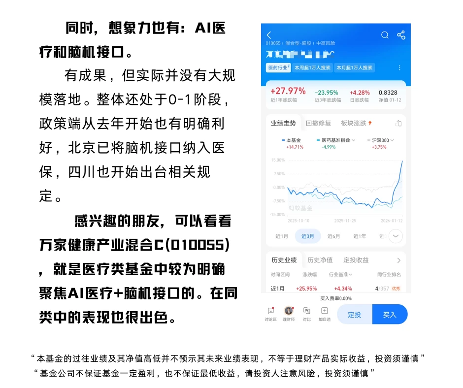 感兴趣的朋友,可以看看万家健康产业混合C(010055) ,就是医疗类基金中较为明确聚焦AI医疗+脑机接口的。在同类中的表现也很出色。
