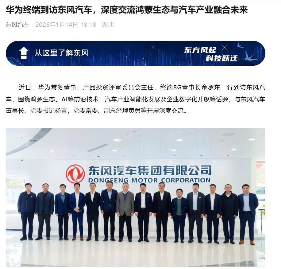余承东到访东风汽车! 近日,余承东一行到访东风汽车,与与东风汽车董事长杨青等围绕鸿蒙生态、AI等前沿技术、汽车产业智能化发展等开展深度交流。 去年8月份,东风汽车董事长记杨青赴深圳拜访华为公司创始人任正非。 余承东此访应该是进一步落实双方的和合作。 此前,有媒体报道,双方或将以猛士为基础,打造“Hi”模式和“智选车”模式之外的新模式。