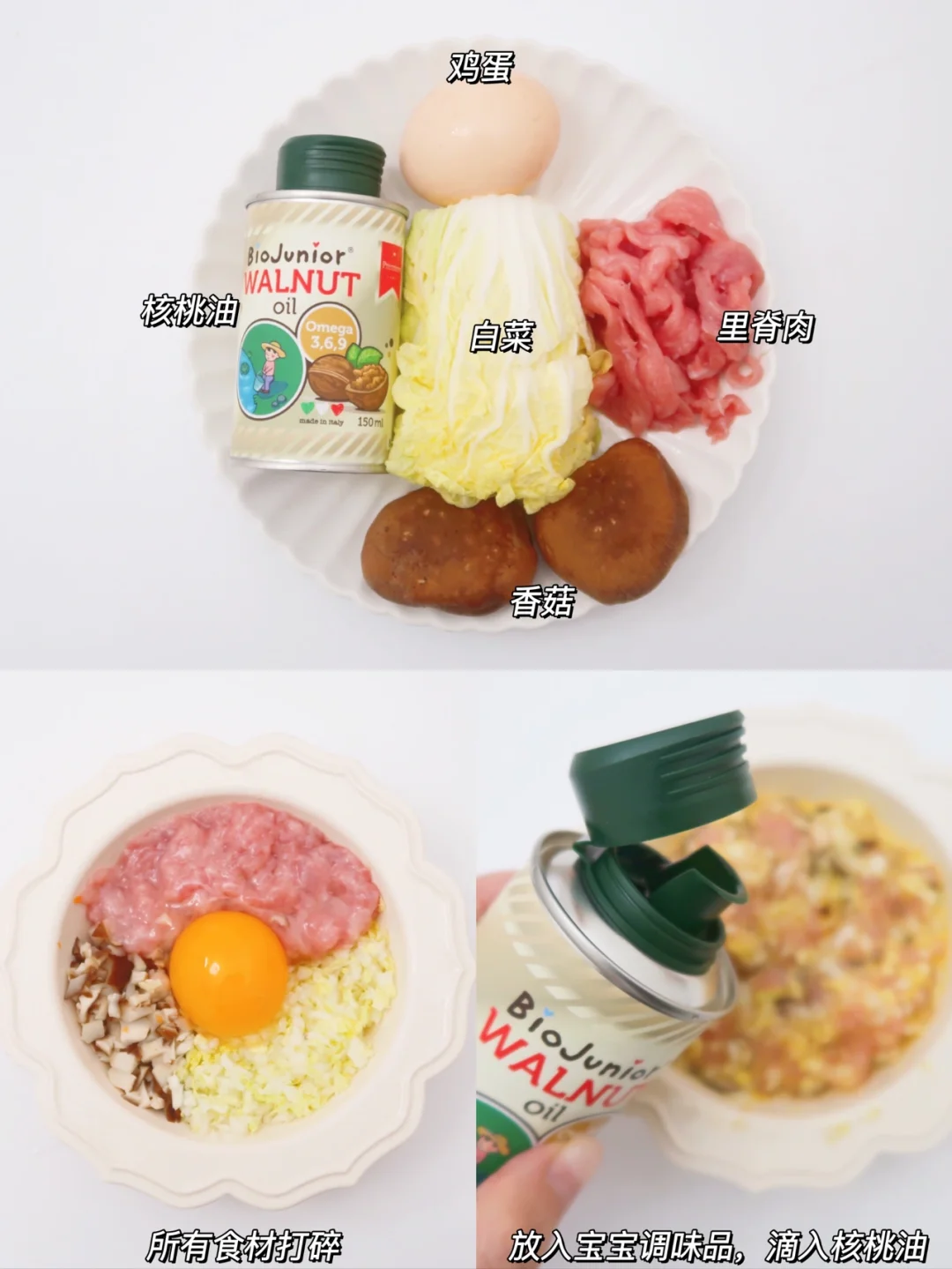 月亮是从小就很爱吃面食,我是十个月以后就逐渐给她做这种迷你小馄炖饺子,一口一个,小宝宝焯水打碎也很好咀嚼消化,一岁以上小朋友就可以放调味品,馅里有蔬菜有肉,孩子也没办法挑食啦,每一个都没有规定的量,因为吃不完可以放保鲜收纳盒冰冻起来,我基本每一个都放了鸡蛋因为我月亮最近不爱吃蛋黄,大家也可以不放哈,真的很鲜,做完了煮了一碗月亮光盘行动,今天调味品我用了宝宝盐和酱油和碧欧奇白金罐核桃油,月亮开始添加油我就是用这个,这款可以热炒烟点达到了220度,还可以冷调,而且金属瓶身避光同时更能确保保鲜,150毫升小罐装就不用害怕浪费啦,平时滴粥面里也不错哦,味道很淡,孩子也很容易接受✌️