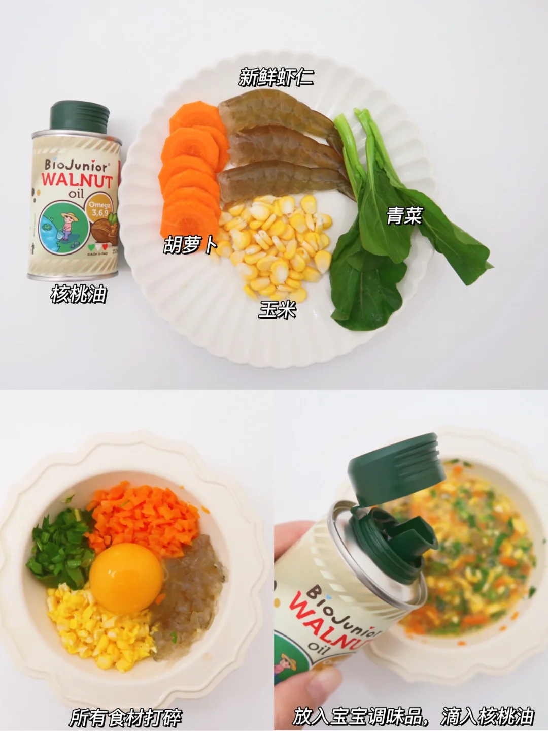 新鲜虾仁➕玉米➕胡萝卜➕青菜➕鸡蛋