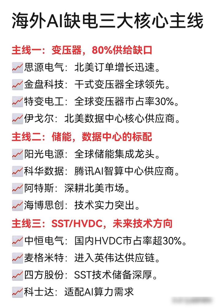 海外数据中心集体断电!三大中国赛道一夜爆火! 最近看科技新闻真是感慨,全球AI跑得再快,也得先过电力这道坎儿。微软、OpenAI的GPU因为缺电闲置,英伟达急得发预警,连新建数据中心都得排队等供电,审批要三年——这哪是拼算力啊,分明是在抢电力容量。听说2026年北美就要面临硬缺口,这电力饥荒要是不解决,AI再牛也得卡壳。 不过咱中国供应链这回可支棱起来了。变压器订单排到2027年,工厂交货就被抢空;储能系统更是关键,AI用电像闪电一样猛,没这玩意儿电网分分钟跳闸;还有英伟达认准的SST/HVDC技术,效率98%,体积小一半,简直是数据中心的续命神器。特变电工的超高压变压器、宁德时代和阳光电源的储能方案、麦格米特的SST技术……这些名字现在在全球估计都被念烂了。 以前总说中国是"世界工厂",现在看,咱们正变成全球AI的"电力后盾"。硅谷为一度电发愁的时候,国内工厂连夜赶工,把电力设备做成了新出口王牌。这哪是简单的制造优势?是产业链从上游到下游的全面领先。作为关注制造业的老网民,看着这些消息真挺提气——科技革命的浪潮里,中国供应链从来没掉过链子。