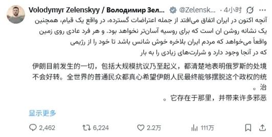 泽连斯基蹭伊朗热度。和奶龙一样,泽连斯基也要不断保持热度,否则会被人遗忘。所以,尽管伊朗和乌克兰八竿子打不着,但有热度泽连斯基就要去蹭,顺便给以色列、美欧表一下忠心。