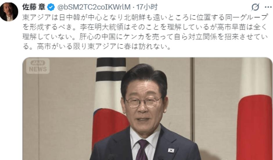 送走李在明后,高市早苗还没回味完这次日韩交流,她就被骂的“狗血淋头”。   李在明刚离开东京没几天,日本国内的舆论就炸了锅,矛头不是对外,而是直直指向高市早苗,带头开火的,是佐藤章,说话一点不拐弯,几乎是贴脸输出。   佐藤章先把话题拉到大格局上,他的判断很明确,东亚要真正实现经济腾飞,靠零敲碎打没用,核心突破口只有一个,中日韩联动,再把朝鲜也纳入合作框架。   这不是情怀,而是算账算出来的结果,四个经济体一旦形成稳定协作,不只是区域受益,全球经济格局都会被迫重新排座次。   在他看来,这是一张明晃晃的“地缘红利支票”,现在中日韩本身的经济体量就已经够大,如果不内耗、而是协同向前,那产生的能量,连欧美传统经济中心都不得不认真对待。   但问题不在条件,在人,佐藤章直接把两位领导人放在一起对比,李在明在他眼里,是那种愿意面对现实、也敢动手调整路线的人,地缘环境摆在那里,躲不开、也绕不过,那就干脆把压力转化成筹码,为发展服务。   李在明的做法也确实符合这套逻辑,一边推进与中国的经济合作,一边尝试缓和半岛紧张关系,不是心血来潮,而是算清楚成本和收益之后的选择,邻居换不了,那就学会把关系用好。   反过来看高市早苗,佐藤章的评价就相当不客气了,他认为,这位日本首相还停留在旧时代的对抗思维里,对周边国家的第一反应永远是防备和强硬,不是想着怎么合作共赢,而是习惯性先树敌。   在他看来,这种路线不仅目光短浅,更是在亲手砸日本自己的发展空间,他甚至直言,只要这种思路继续主导日本政坛,东亚的和平与繁荣就很难真正到来。   为了让批评更有分量,佐藤章还拉出了历史做对照,二战前的日本军部,同样是认死理、拒绝调整,结果把国家一步步拖进深渊,普通民众不是不明白问题出在哪,只是没机会左右方向。   其实,“东亚共同发展”这套思路并不新,前首相鸠山由纪夫喊了很多年,但始终推不动,原因很现实,承认合作,就意味着承认时代变了,而这正是日本右翼最不愿面对的事。   可现实不会等人,全球经济结构正在重组,日本能调整方向的时间窗口已经越来越窄,如果还抱着对抗逻辑不放,结果很可能只能站在一边,看着别人把蛋糕分完。   佐藤章的话听着刺耳,却戳中了关键,在国家发展这本账里,从来没有“赌气”这一项,真正成熟的选择,看的是利益和结果,而不是情绪和姿态,东亚这盘棋并不复杂,难的只是,执棋的人愿不愿意放下成见,为普通人的生活认真算一笔明白账。