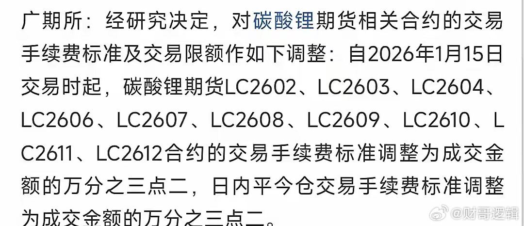 碳酸锂迎来重大利好,锂电池板块又要冲一波了广期所2026年1月15日起对碳酸锂期货10个合约的手续费与交易限额调整,平今仓手续费均调为成交金额的万分之3.2,此前远期合约多为万分之1.6 。也就是说手续费增加了一倍。就是明摆着告诉投资者碳酸锂的价格不会有太大的波动了,可以拉涨了。这招就是为了抑制高频交易,短线投机。投机降温后价格更贴基本面,趋势更清晰,投资者可以放心进入碳酸锂所在的产品里面投资,也就是锂电池板块。今天下午光伏突然的拉升可能就和这个消息有关,就看明天能否继续上涨了。