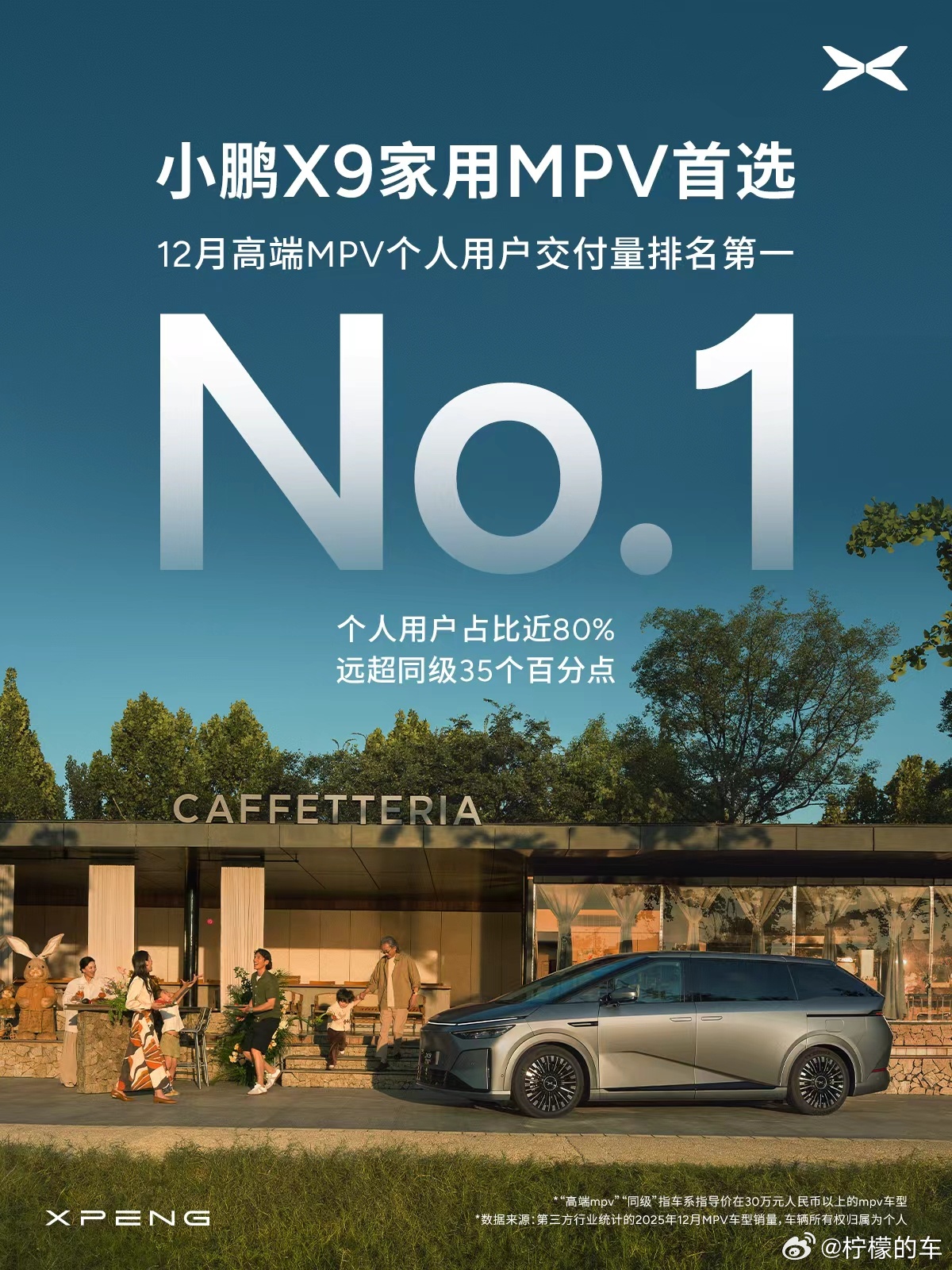 小鹏X9最近在香港和国内市场的表现,真的让人对国产高端MPV刮目相看,它不仅在2025年第四季度蝉联香港全品类MPV销量冠军,12月单月更是稳居香港豪华MPV销冠,这在以前的MPV市场,可是很难想象的小鹏X9登顶高端MPV个人用户交付量第一小鹏X9登顶香港MPV双季度销冠更关键的是,在国内市场,它12月的交付量创了新高,达到5000多台。而且个人用户交付占比接近80%,直接能证明这台车是家庭用户的首选,而不是单纯靠商务采购撑销量,amazing