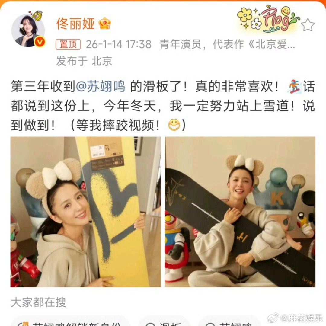 2026年1月14日,佟丽娅在社交平台晒出一块崭新的专业滑雪板,透露这是她连续三
