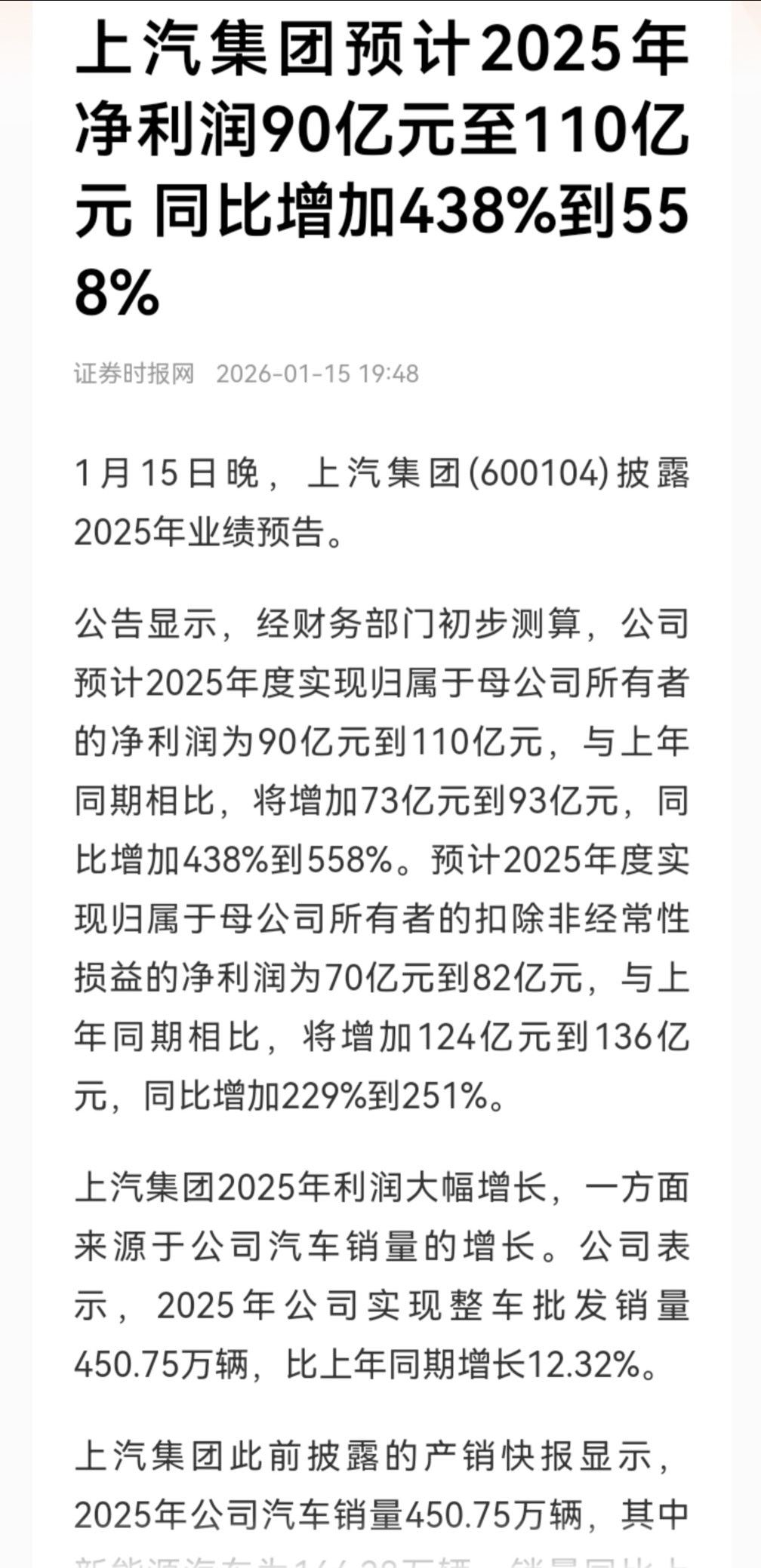 上汽集团预计2025年净利润为90-110亿元,同比增加438%到558%太猛了