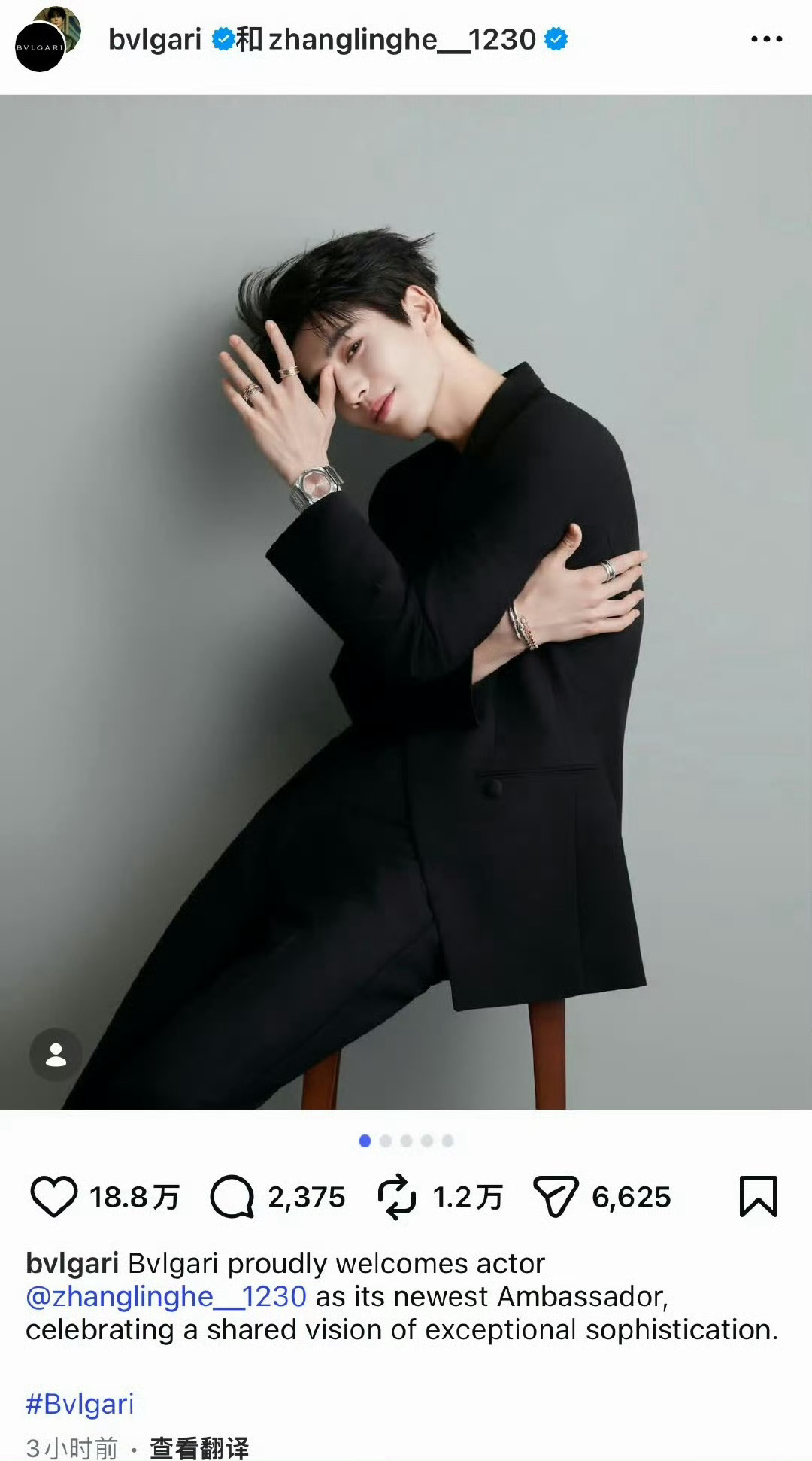 张凌赫宝格丽品牌大使 恭喜我赫无缝又拿下一奢牌!就这个时尚宠儿必须支持!!! 张凌赫官宣宝格丽