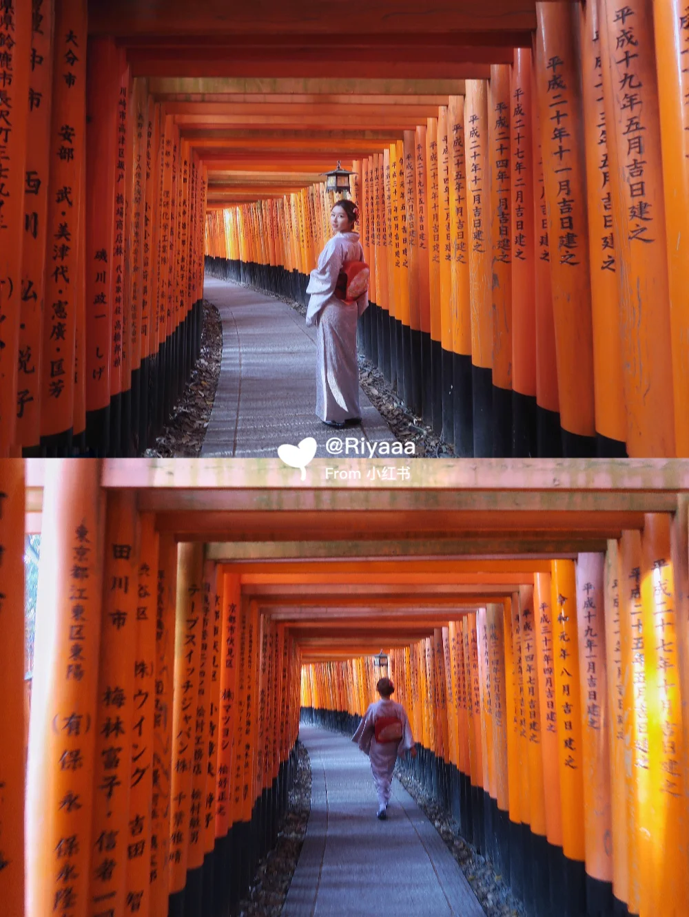 🔸14:00 伏见稻荷大社[地点]:游客太多,想要拍出无人大片除了早起,下午也可以哦!有两条平行小的 千本鸟居[地点],从右边进入,左边返回,返回的那边鸟居上是刻字的,借拐角处趁前面的人刚走赶紧拍!