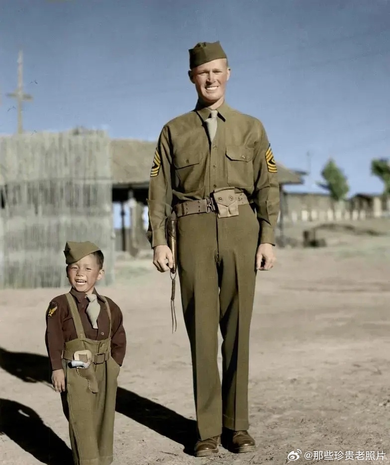这张照片拍摄于1944年的云南昆明,照片中的小男孩是美国志愿航空队(飞虎队)收养的一名孤儿,给他取名叫“小老虎·乔”。照片中的他戴着船形帽,穿着有臂章的小号军装,系着领带穿着肥大的背带裤,模仿旁边的一级上士罗伯特·杜尔森站岗,而且他的腰间也有模有样地别着一把玩具左轮手枪。“小老虎·乔”,因父母死于日军轰炸成为孤儿,被飞虎队收养后,队员为他定制了缩小版军装,还配备了特制小手枪,他也成为飞虎队工兵连年龄最小的“士兵”。