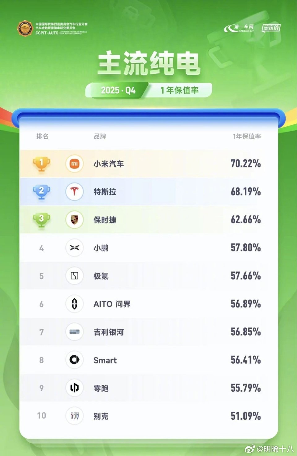 主流纯电汽车1年保值率排名,小米汽车第一。