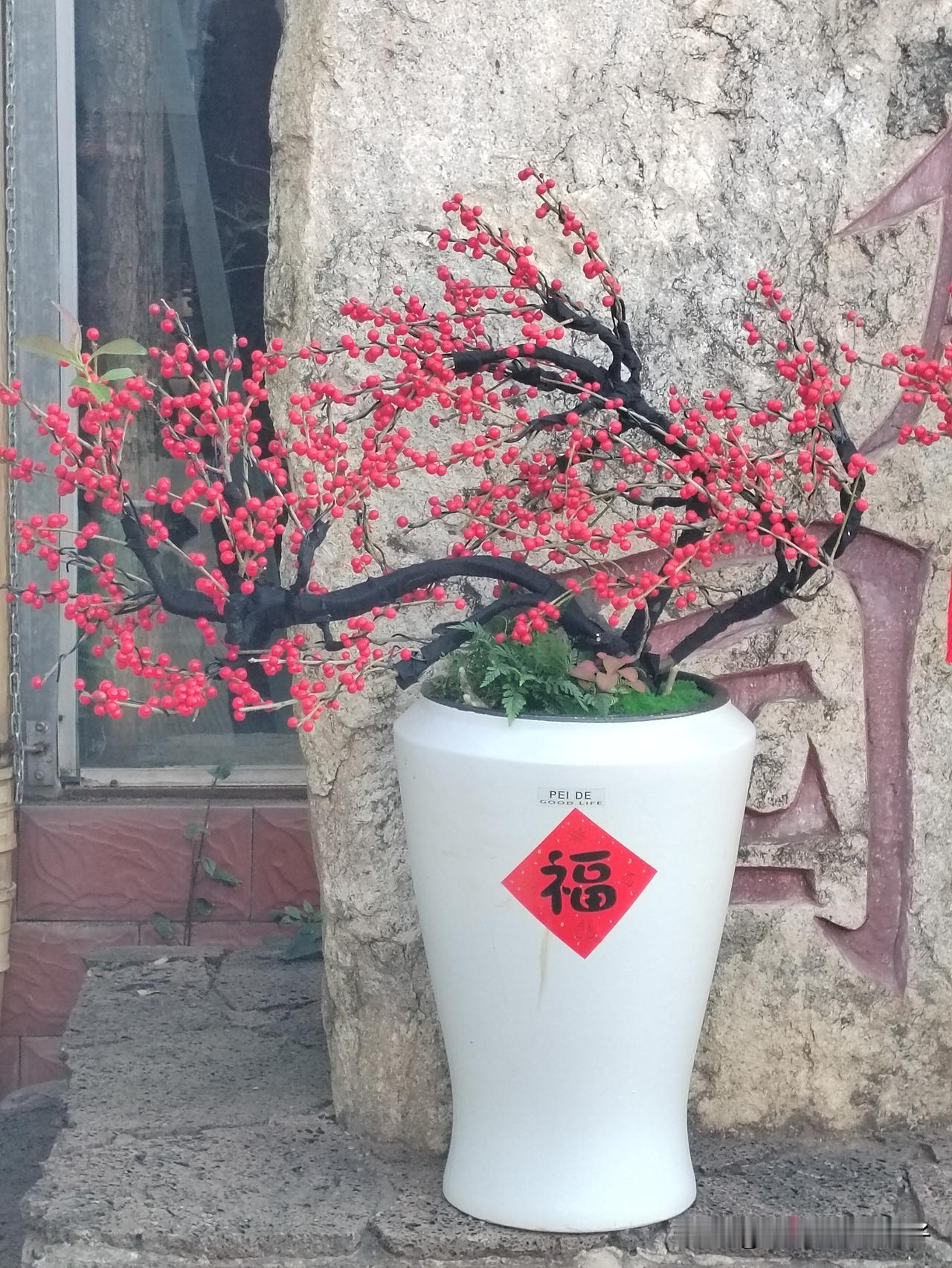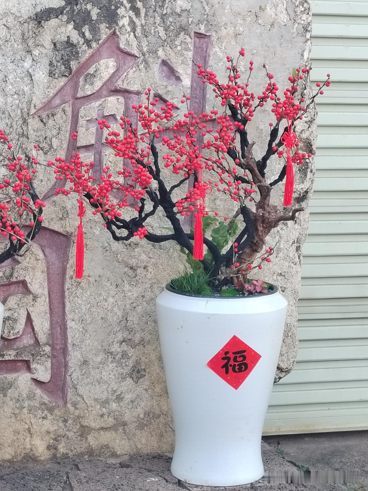 刚栽好的两盆冬青! 也太有年味了! 这歪歪扭扭的黑枝桠,上面结满了满满的冬青果子,树上没有一点叶子,亮堂堂的。 白瓷瓶上贴的福字红得晃眼,还有几串红流苏垂着,风一吹就轻轻飘。往墙根一放,冷飕飕的冬天都多了股热乎气儿。 看着这满枝的红火,就觉得新的一年肯定啥都顺,福气也能攒得满满当当的😄😄😄红果靓冬青 庭院冬青树 树红果冬青价格 冬青苗木 红果造型冬青树 常绿冬青 红果造型冬青树