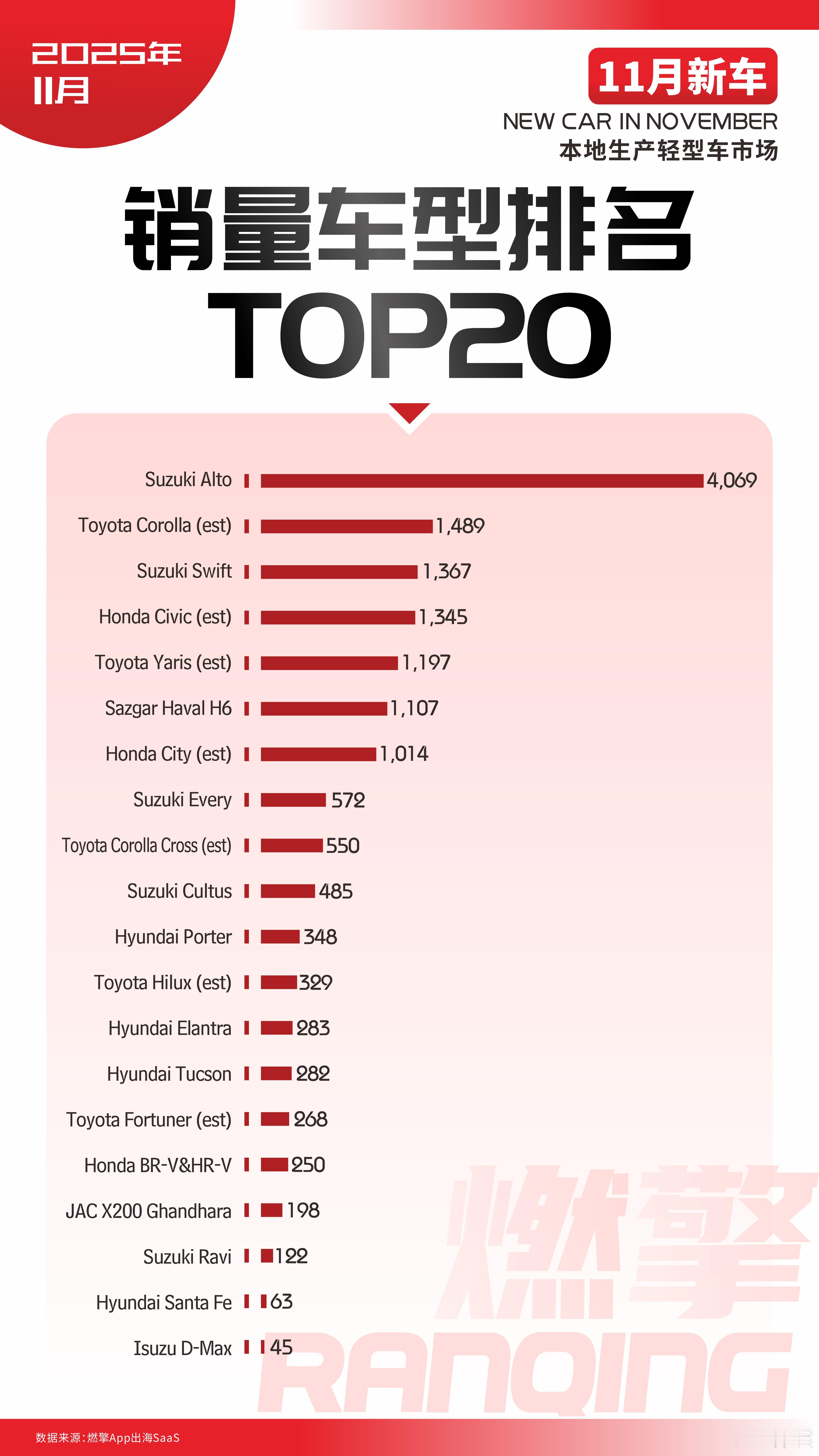 巴基斯坦车市:哈弗H6是当红辣子鸡11月,巴基斯坦本地生产的轻型车销量前二十车型榜单,清晰地反映了当地市场的消费结构:由日系经济车型绝对主导,同时中国品牌在特定领域成功切入。日系经济车型占据绝对核心铃木奥拓以4069辆的销量断层式领跑,堪称巴基斯坦的“国民车”。这款微型经济轿车以其极低的购置与使用成本,精准契合了当地家庭代步与城市通勤的刚性需求,奠定了市场基调。榜单前列亦被铃木雨燕、铃木Every等同品牌车型占据,巩固了其在经济型小车领域的统治地位。与此同时,丰田卡罗拉、本田思域等家用轿车稳居前列,满足了中等收入家庭对品质出行的需求,与入门车型共同构成了市场“双支柱”。中国品牌实现乘商双线突破中国品牌车型在榜单中取得了标志性突破。赛格哈弗H6以1107辆的销量成为唯一跻身前十的中国车型,其凭借高性价比的SUV定位,成功满足了当地消费者对更大空间和复杂路况适应性的需求。此外,江淮X200作为一款轻型商用车,以198辆的销量填补了货运细分市场,展现了另一条突破路径。市场格局高度聚焦实用需求整体来看,榜单车型高度集中于经济型轿车、家用轿车、SUV及轻型商用车这几大类别。这全面覆盖了巴基斯坦从个人家庭出行到小型商户货运的核心场景,实用主义是市场的绝对主导逻辑。综上所述,巴基斯坦本地市场是日系车型,尤其是经济型小车的天下,其地位稳固。中国品牌则通过哈弗H6在乘用车市场、江淮在商用车市场的针对性产品,成功实现了主流榜单的突破,为后续进一步拓展份额奠定了基础。大v聊车