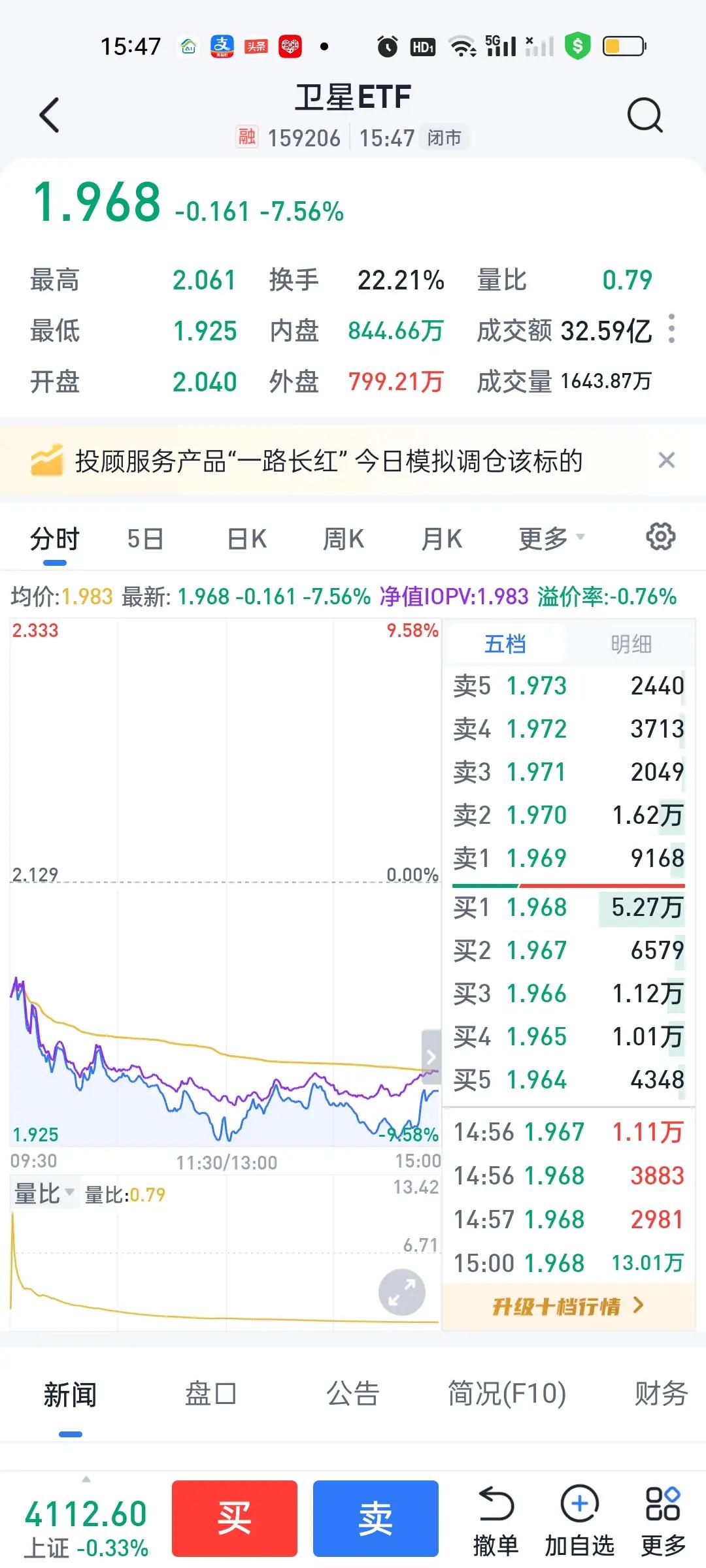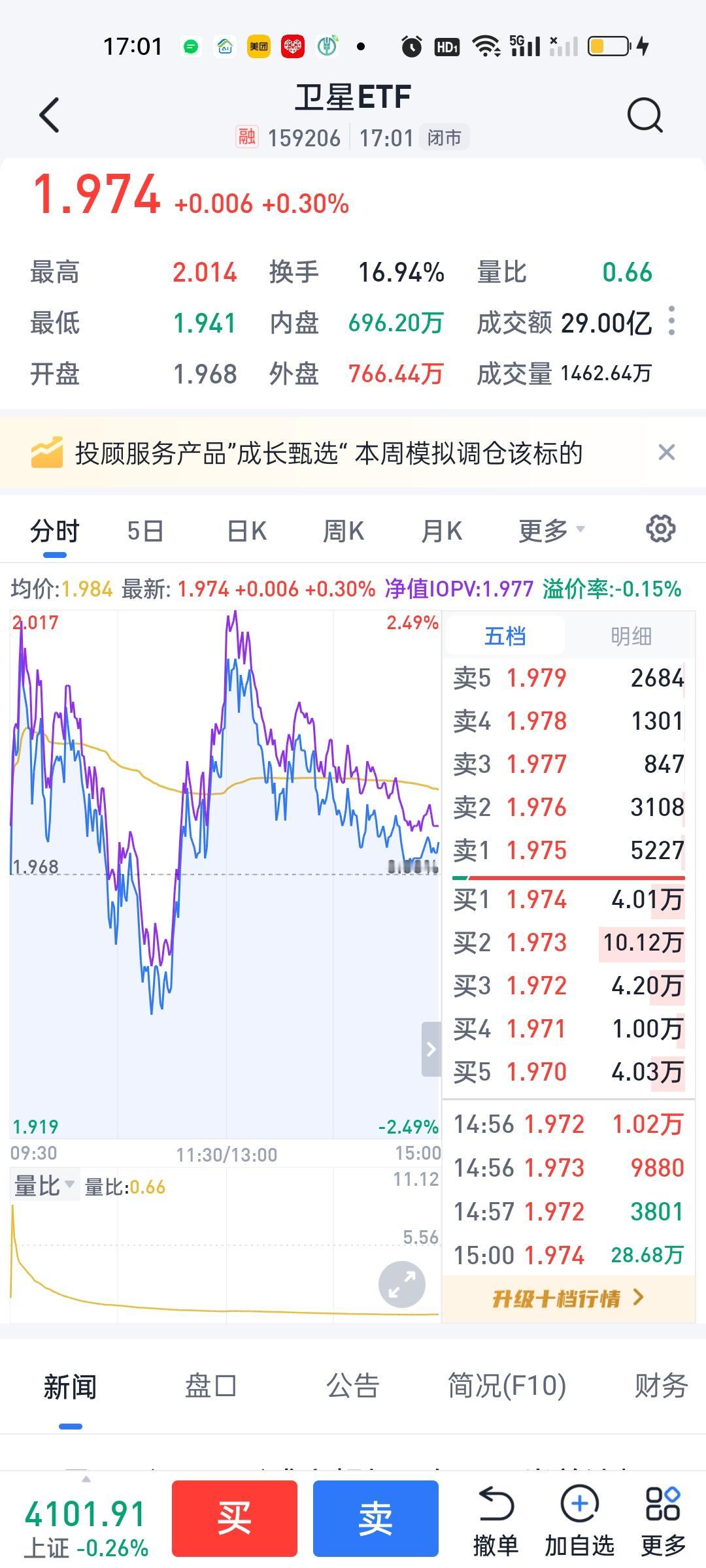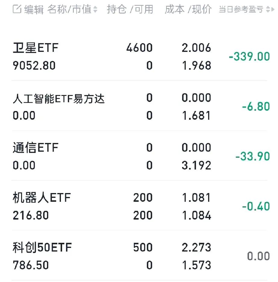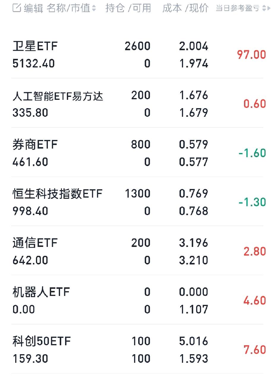 今天场内账户还是盈利的,盈利了100,但昨天亏损300多,所以今天的盈利就不值一提了。尽管整个1月份还是盈利的。如果我今天对卫星ETF完全不做操作,昨天收盘1.968,今天收盘1.974,涨了6个基点,4600*0.006=27.6元,我今天通过来回做T挣了97元,也就是说我通过来回做T比死拿着不动多挣了70元,从这个角度讲我今天做T是成功的。 我也考虑过1.974再加仓2600股,这样5200股的持仓成本可以变成1.974+2.004=3.978,3.978/2=1.989。但考虑到下周初依旧会有调整而且1.884这个下方缺口是必补的,所以哪怕成本做到了1.989也是很危险的位置。1.884/1.989=0.9472,还要跌5.28%。思来想去没有再最后时刻加仓,这样进可攻退了守! 从内心深处,我不害怕它暴跌,因为我时刻准备着,就算它跌到了1.800,我直接1万股,成本也会马上被平均到2.004*2600+18000=23210.4,23210.4/12600=1.842。我认为卫星ETF在1.800这个位置附近还是很安全的。所以我不怕它暴跌。暴跌就补仓,就这么简单!
