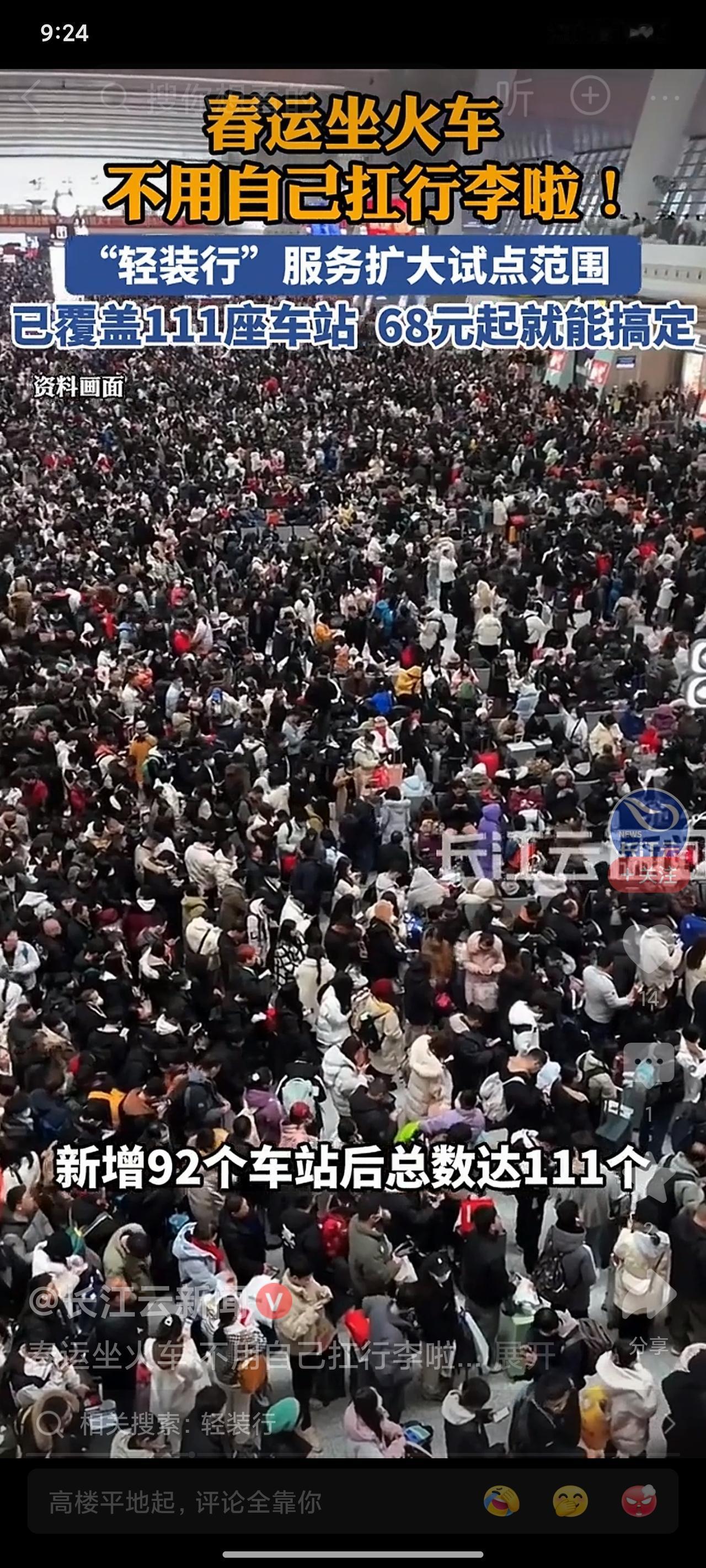 春运救星!坐火车再也不用扛行李,111站全安排,68元上门取送太香了 每年春运最崩溃的就是拎着大包小包赶火车,又沉又挤,胳膊酸到抬不起来,今年终于不用遭这罪了! 铁路直接放大招,把便民的行李搬运服务扩到了全国111座车站,省会、直辖市这些热门城市全覆盖,同城35公里内,行李全程不用自己碰,主打一个轻装上阵赶火车! 不管是出发还是到站都能约,12306APP或者小程序点几下就搞定,特方便。出发前提前约,工作人员直接上门取行李,安检完要么送车站柜子,要么直接送到站台,再也不用拖着箱子挤地铁赶车;到站前约好,下车不用等不用找,5小时内行李直接送家门口,这体验感直接拉满! 收费也特实在,送到车站/从车站送家68元一件,想直接送站台的话98元,商务座还能享行李直送候车厅,这个价格对比春运搬行李的麻烦,真的花小钱省大心,我觉得超划算! 就一点要注意,行李别超规:普通旅客一人能带20公斤,动车行李长宽高加起来别超130厘米,普速车160厘米,禁带的东西别装,免得耽误行程。 网友们都直呼太贴心了,说 “早该出这服务了,春运幸福感飙升”“再也不用当春运大力士了”, 我也觉得这才是真真切切的便民服务!从去年19个试点站到现在111站,铁路是真的听进去大家的需求了,今年春运终于能轻松坐车了~ 有没有姐妹今年春运打算冲这个服务的?评论区聊聊~