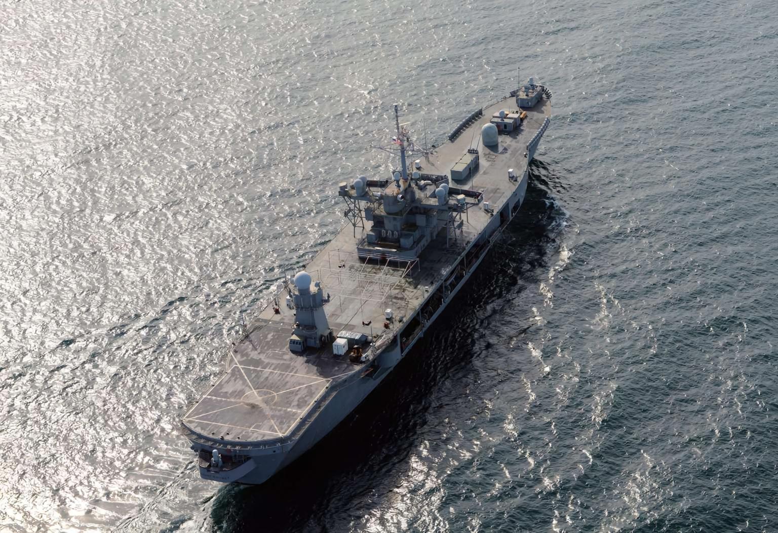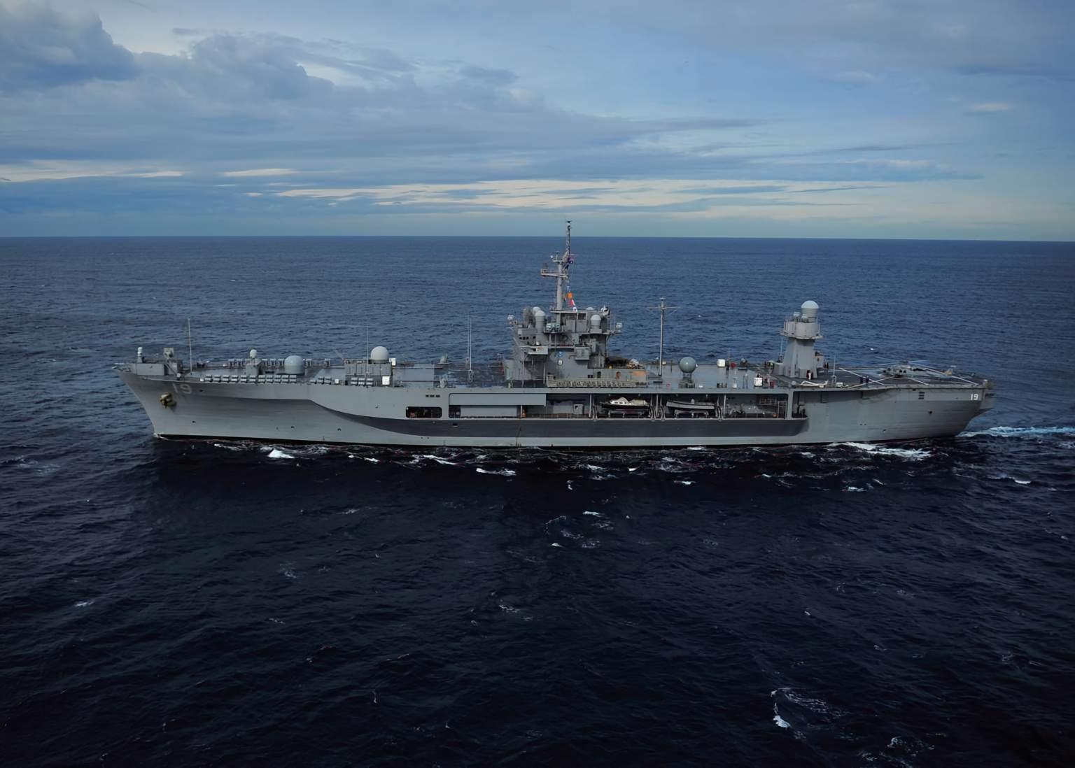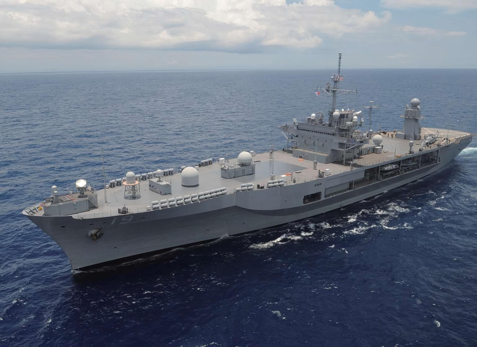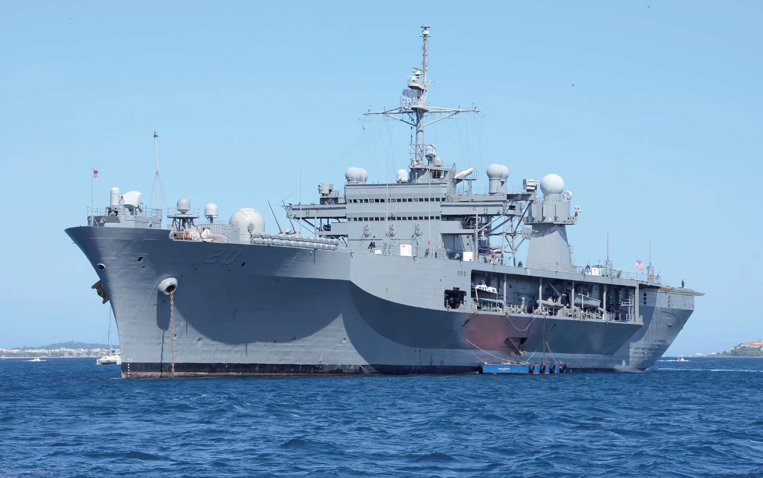 每天认识一件兵器 “蓝岭”级两栖指挥舰“蓝岭”级两栖指挥舰(Blue Ridge command ship)是美国于20世纪60年代建造的两栖指挥舰,一共建造了2艘。“蓝岭”级两栖指挥舰是美国自二战以来建造的最大的指挥舰,也是美国海军海上综合作战指挥能力最强的战舰。1969年1月,首舰“蓝岭”号在美国费城海军造船厂下水,次年11月加入美国海军服役。经过一段时间的试验,“蓝岭”号于1979年10月正式成为美国海军第七舰队的旗舰。二号舰“惠特尼山”号1971年1月16日服役,成为美国海军第六舰队的旗舰。与美国海军老一代的旗舰相比,“蓝岭”级两栖指挥舰基本不具备执行其他任务的能力,完全是一艘专用的舰队指挥舰。该级舰的上层建筑集中配置在中部甲板,与烟囱为一体形成了一个大型舰桥,上层建筑的前部是一个大型四脚桅,后部是一个筒桅,上甲板尾部设有一个直升机起降甲板,可以停放一架中型直升机,但未设机库。“蓝岭”级的舰载武器较少,最初仅有两座八联装Mk 25“海麻雀”舰对空导弹系统和两座Mk 33双联装76毫米舰炮,1987年的现代化改装中又加装了两座Mk 15“密集阵”近程防空武器系统。“蓝岭”级两栖指挥舰的“旗舰指挥中心”是一个大型综合通信及信息处理系统,它与70多台发信机和100多台收信机连接在一起,同三组卫星通信装置相通,可以每秒3000词的速度同外界进行信息交流。接收的全部密码可自动进行翻译,通过舰内自动装置将译出的电文送到指挥人员手中,同时可将这些信息存储在综合情报中心的计算机中。这种信息收发处理能力,在目前世界现役的所有指挥舰中都很少见。烽火问鼎计划|全球武器装备盘点