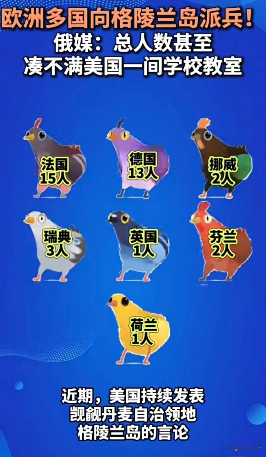 美国自从表露觊觎格陵兰岛野心以来,就一直动作频频,而欧洲和丹麦方面也是不得不做出应对。 近日,德国、法国和英国等北约国家决定响应丹麦的号召,向格陵兰岛派兵。但是,从相关国家派兵规模来看,实在让人有点忍俊不禁,7个国家总共只派了37名士兵,被俄罗斯媒体讥讽道:“总人数凑不满美国的一间学校教室”。 面对美国方面咄咄逼人的态势,由于自身实力有限,加之还要帮乌克兰对抗俄罗斯,欧洲国家除了做做样子,大概率也不会有更好的办法了。至于格陵兰岛的最终归属问题,只要美国人想要,很快就会有结局了。