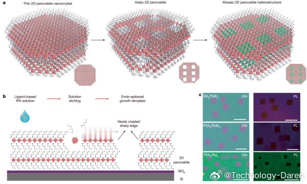 最新科技消息 【我国科研人员发明晶体“自刻蚀”新工艺】近期,中国科学技术大学科研团队等,在新型半导体材料领域取得重要进展,首次在二维离子型软晶格材料中,实现了面内可编程、原子级平整的“马赛克”式异质结可控构筑,为未来高性能发光和集成器件的研发开辟了全新路径。以二维卤化物钙钛矿为代表的离子型软晶格半导体,其晶体结构柔软且不稳定。这一特性使得传统光刻加工等技术难以实现高质量的横向异质集成。因此,在离子型软晶格半导体材料中实现高质量、可控外延的横向异质结精密加工,一直是重要的科学难题。面对这一挑战,研究团队独辟蹊径,创新性地提出并发展了引导晶体内应力“自刻蚀”新方法。团队发现,二维钙钛矿单晶在生长过程中会自然累积内部应力。团队巧妙设计了一种温和的配体—溶剂微环境,能够选择性地激活并利用这些内应力,引导单晶在特定位置发生可控的“自刻蚀”,从而形成规则的方形孔洞结构。团队进一步通过快速外延生长技术,将不同种类的半导体材料精准回填,最终在单一晶片内部构筑出晶格连续、界面原子级平整的高质量“马赛克”异质结。这种全新的加工方法不是通过“拼接“不同材料,而是在同一块完整晶体中,引导其进行精密的“自我组装”。这意味着,未来有可能在一块极薄的材料上,直接“生长”出密集排列的、能发出不同颜色光的微小像素点,为高性能发光与显示器件的发展,提供了全新的备选材料体系和设计思路。这一研究首次在二维离子型材料体系中,实现了对横向异质结结构的高质量、可设计性构筑,突破了传统工艺的局限。同时,研究展现的驾驭晶体内应力与动力学新范式,实现了单晶内部功能结构的可编程演化,为探究理想化界面物理提供了新平台,也为低维材料的集成化与器件化开辟了新路径。相关研究成果发表在《自然》(Nature)上。网页链接
