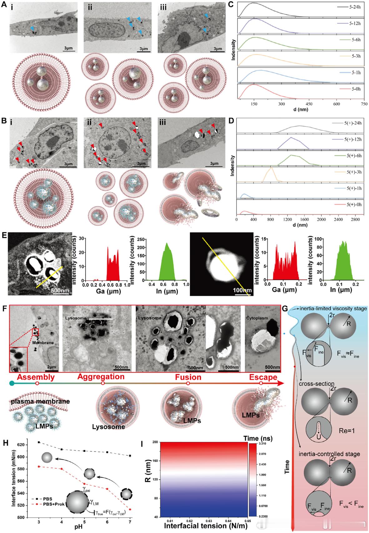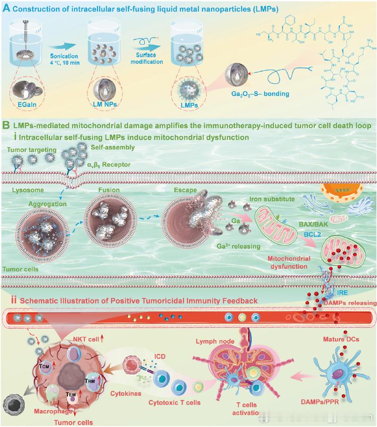 最新科技消息【我国液态金属柔性电子制造研究取得进展】近日,中国科学院理化技术研究所在可变形液态金属纳米颗粒(LMPs)的细胞内外动态行为机制研究中取得重要进展。该研究从理论及实验层面揭示了液态金属纳米颗粒在肿瘤微环境中的靶向自组装、细胞内自融合及溶酶体逃逸全链条动态作用机制,为新一代智能纳米药物设计提供了新思路(图1)。理化所低温科学与技术全国重点实验室液态金属与低温生物医学研究中心利用液态金属材料变形特性与自组装肽修饰设计,使LMPs具备独特的“动态变形能力”。在细胞膜层面,可变形液态金属纳米颗粒可实现主动靶向与自组装,强化了微观定向传质效果,显著提升了肿瘤细胞对其的内吞效率(图2)。进入溶酶体后,酸性/酶微环境作用使得液态金属氧化膜逐渐消失从而触发金属颗粒的自融合,实现“先小后大”的细胞内尺寸跃迁。研究团队对该过程进行了深入的数理计算和透射电镜微观对比分析,将融合过程划分为惯性限制粘性阶段、过渡阶段以及惯性控制阶段,为持续线粒体应激与诱导细胞死亡效应放大提供了结构基础(图3)。从溶酶体逃逸后,可变形液态金属颗粒持续释放的镓离子进一步介导了线粒体损伤机制,释放的Ga³⁺通过铁替代途径破坏线粒体铁硫簇组装,干扰了线粒体电子传递链功能,进而触发免疫原性细胞死亡(图4)。更进一步的,结合不可逆电穿孔的破膜技术,LMPs可进一步促进损伤相关分子模式和肿瘤抗原向细胞膜外部释放,激活树突状细胞成熟和记忆性T细胞分化,形成长效抗肿瘤免疫记忆。研究团队通过复挑战实验也验证了“肿瘤特异性免疫记忆”的建立:联合治疗可诱导更强的肿瘤特异性T细胞反应,并在同源肿瘤再接种中获得显著保护;而对异源肿瘤并未表现出同等保护,提示该记忆应答具有抗原特异性。这为“局部治疗-系统免疫-长期记忆”的闭环提供了证据支撑,也凸显了该策略在“原位疫苗化”方向的潜力。相关研究工作以Liquid Metal Nanoparticles-Mediated Mitochondrial Damage Enhances Immunogenic Cell Death for Cancer Vaccine Therapy为题发表在Advanced Materials。论文第一作者为中国科学院理化技术研究所和北京中医药大学联合培养生戚瑜瑕、于中阳,及中国科学院理化技术研究所研究生张杰,中国科学院理化技术研究所饶伟研究员、国家纳米科学中心王磊研究员及北京中医药大学东方医院周天主任医师为本文通讯作者。本研究工作得到了低温科学与技术全国重点实验室的大力支持,团队通过生物传热传质、材料学和医学等多学科交叉融通形成科研合力,阐明了可变形液态金属纳米颗粒“由小变大、由外入内、由静变动”的物理化学作用机制,也为解决纳米材料在单细胞中的滞留与渗透矛盾提供了全新的研究思路。论文链接:网页链接