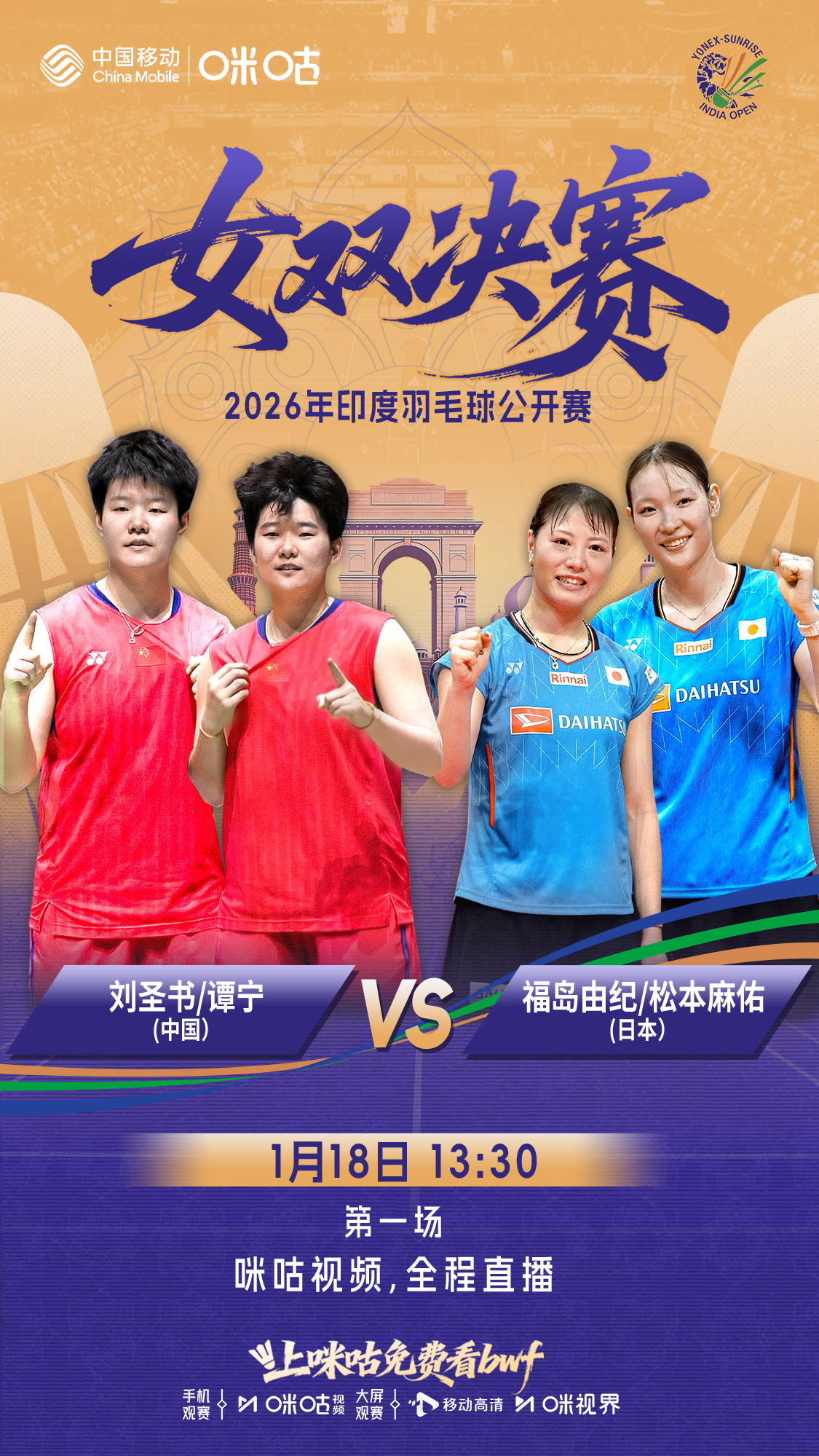🏸 2026印度羽毛球公开赛 ⏰ 13:30女双决赛🇨🇳 刘圣书/谭宁迎战日本女双🏆 圣坛组合冲击新年第二冠📺 #上咪咕免费看BWF# 网页链接