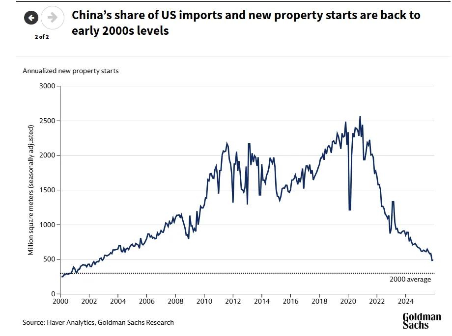 高盛:中国新房开工量降至2000年水平。 看到这个数据还是很震惊! 现在房地产开发量竟然退到了25年前! 这已经不是软着陆, 而是百分之百的硬着陆。 任何事物发展都会有周期, 现在房地产下滑得越多, 未来反弹的力度就会越大。 日本,韩国前面已经演示过, 香港也已经开始反弹演示, 那么, 中国内地什么时候开始反弹呢?