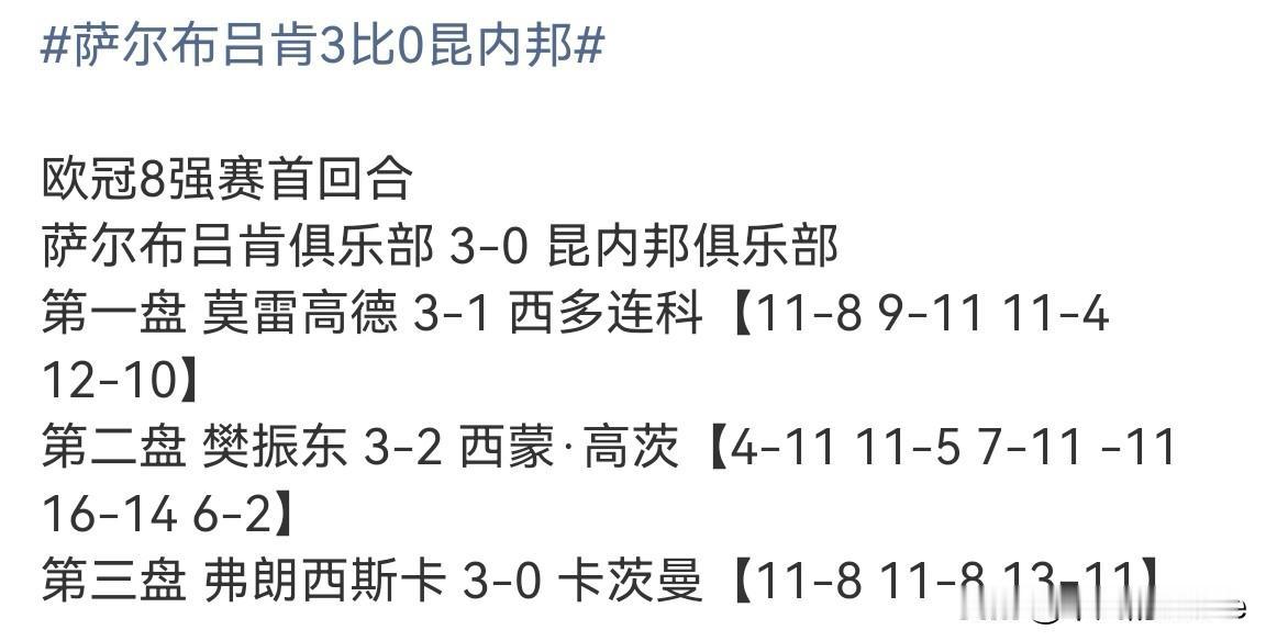 1月19日,萨尔布吕肯以3-0战胜昆内邦,莫雷加德、樊振东和小弗队长各拿下一分,小莫迎来欧冠联赛开门红。 具体比分如下: 莫雷高德 3-1 西多连科 樊振东 3-2 西蒙·高茨 弗朗西斯卡 3-0 卡茨曼 西蒙·高茨还有点厉害哟,居然和东东打了5局才分出胜负。 东东的比赛已经排到了2月份,不知道他能不能回家过年,我们一起为他加油吧!