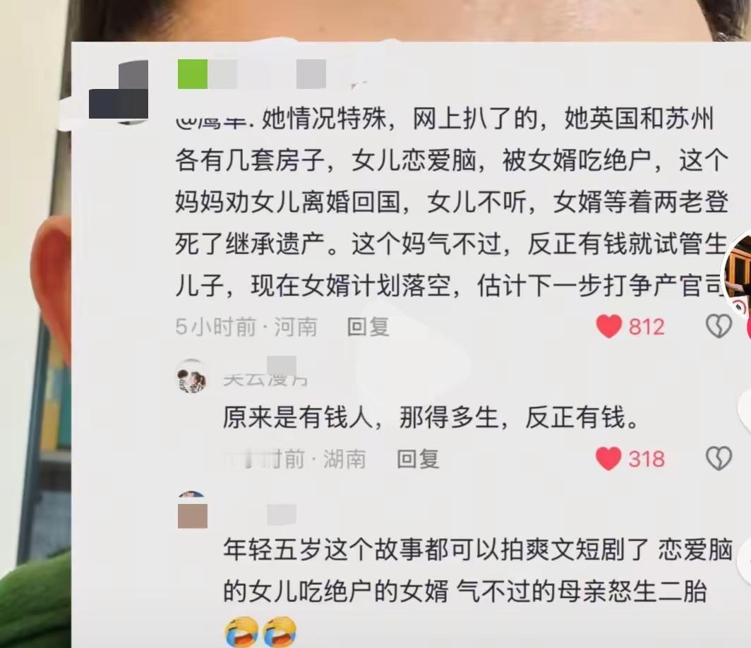 59岁坚持生二胎的宝妈,她家真的是有实力,在英国和苏州都有几套房子。因为他们只有一个女儿,女婿很强势,本来说好的生了二胎跟妈妈姓,女儿又立不起来, 什么都听丈夫的,后面不但不能第二个孩子跟岳父姓,还直接全家搬了去了英国。对岳父岳母的态度是眼不见,心不烦。就只等这老两口眼一闭,女婿就准备继承遗产了。 岳母早就看透了女婿,想让女儿离婚回国,可女儿早就不跟他们一条心了,心里只有自己的丈夫和孩子们。 59岁的岳母果断做出了决定,再生一个孩子,绝不能把家产留给一个白眼狼,于是经过一段时间的身体调理,终于迎来了一个男孩。 煮熟的鸭子飞了,这女婿现在只怕后悔的大腿都拍断了。