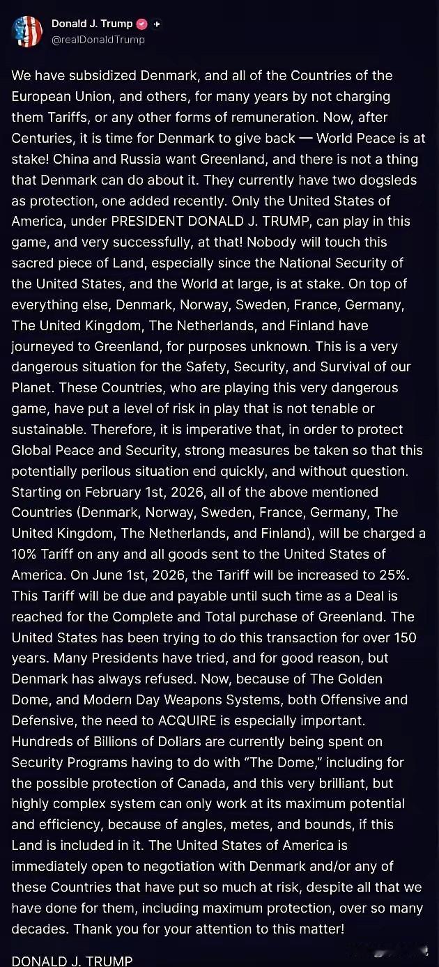 特朗普对格陵兰岛“势在必得”,欧洲各国“怂”是必然的 昨天特朗普又开始发小作文了,大概意思就是美国已经觊觎格陵兰岛150年了,历届总统都是“废物”,没能解决格陵兰岛,作为美国最成功的总统特朗普一定会拿下格陵兰岛。