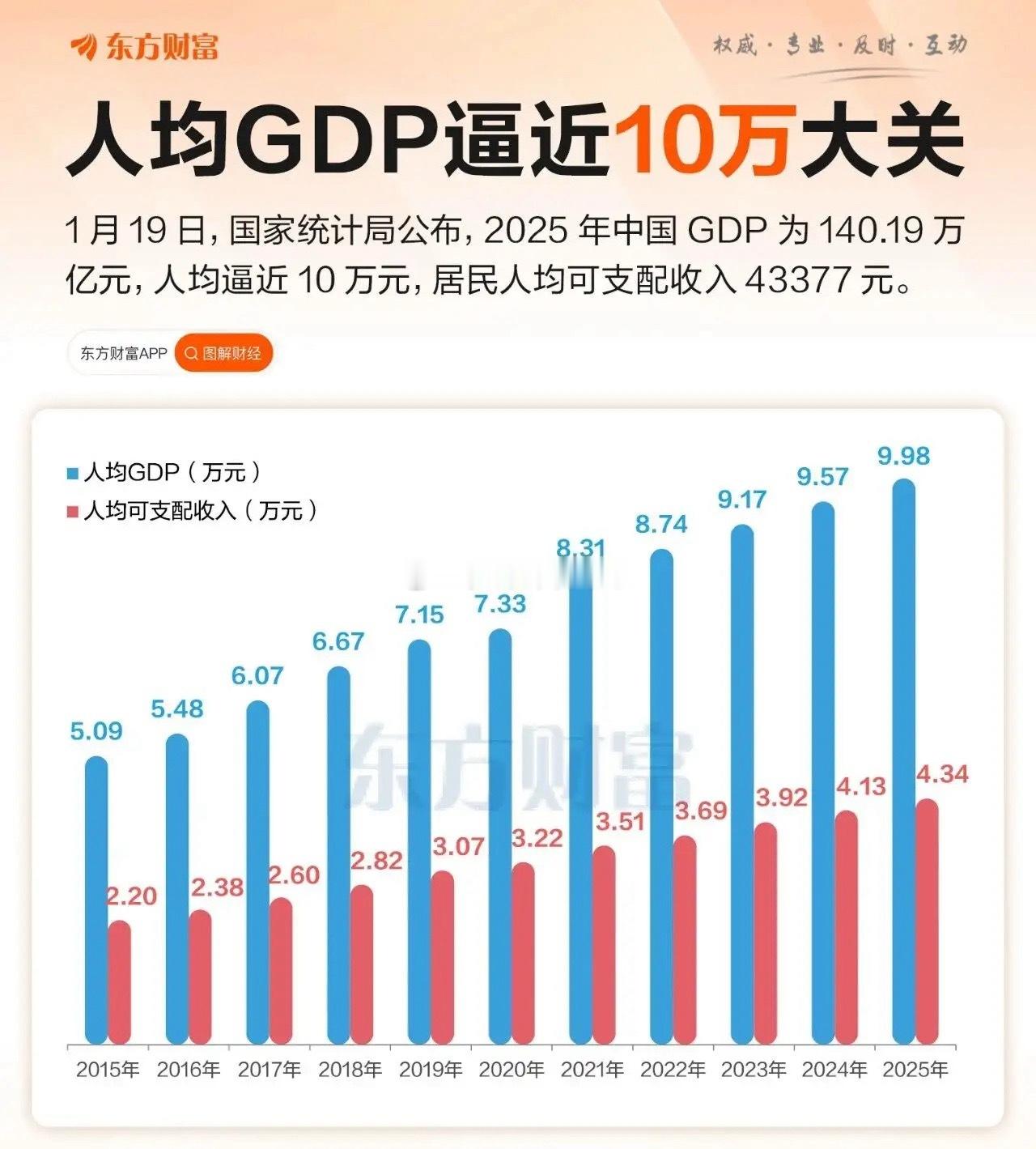2025年我国人均GDP为9.98万元,距10万元大关仅一步之遥,突破这一关卡是迟早的事。人均GDP可是衡量经济发展水平的重要指标,它让我们看到平均每个人创造的经济价值。对比一下2024年世界人均GDP情况,若以人口超30万的国家算,人均GDP最高的卢森堡达13.5万美元,最低的布隆迪仅321美元,而世界平均人均GDP为13900美元。我国人均GDP不断攀升,说明咱们的经济实力和生产效率都在稳步提升。未来,随着各方面发展,突破10万大关后肯定还会迈向新高度。