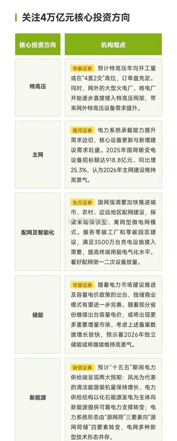 电力能源板块全梳理!本次梳理的4万亿元电力能源领域核心投资方向,涵盖特高压、主网、配网及智能化、储能、新能源五大板块。机构普遍认为各板块受益于政策驱动、需求增长与技术升级,2026年将维持高景气度,具备明确的产业成长与投资主线。特高压板块1. 特变电工作为特高压核心设备供应商,布局变压器、电抗器等核心产品,深度参与国内特高压工程建设,受益于特高压开工量高位运行,订单储备充足,技术壁垒突出,具备长期成长确定性。2. 平高电气是国内特高压开关设备龙头,产品覆盖特高压交流、直流全系列,受益于网外电厂直接接入特高压网架带来的设备需求增长,产能布局完善,客户资源优质,业绩增长稳健。3. 许继电气为特高压直流输电核心设备供应商,聚焦换流阀、控制保护系统等核心环节,受益于特高压工程订单放量,技术实力领先,产业链协同优势明显,成长动力充足。4. 中国西电是国内输配电设备龙头,深度参与特高压项目建设,产品涵盖变压器、开关等核心设备,受益于特高压开工量高位与网外需求增长,产能利用率提升,业绩弹性充足。主网板块1. 思源电气是主网核心设备供应商,聚焦特高压、SVG等核心产品,受益于主网设备更新与新增建设需求旺盛,技术实力突出,订单饱满,业绩增长确定性较强。2. 国电南瑞为主网自动化龙头,覆盖继电保护、调度控制系统等核心环节,受益于主网建设高景气与智能化升级需求,技术壁垒高,客户资源优质,具备长期成长潜力。3. 长高电新是主网设备核心企业,布局隔离开关、断路器等产品,受益于主网设备招标量增长,产能利用率提升,业绩增长稳健,具备一定的安全边际。4. 置信电气为主网设备供应商,聚焦变压器、电抗器等产品,受益于主网建设需求旺盛,技术实力持续提升,订单储备充足,成长动力充足。配网及智能化板块1. 正泰电器是配网设备龙头,布局低压电器、智能电表等产品,受益于配网建设加速与终端电气化水平提升,渠道优势显著,产品结构优化,业绩增长稳健。2. 林洋能源是配网智能化核心企业,聚焦智能电表、储能等业务,受益于配网侧一二三次设备放量,技术实力突出,客户资源优质,具备较高成长弹性。3. 炬华科技是配网智能化设备供应商,主营智能电表、用电信息采集系统,受益于配网建设与终端电气化需求增长,产能利用率提升,业绩增长确定性较强。4. 三星医疗为配网设备与医疗双主业企业,配网板块聚焦智能电表、变压器等产品,受益于配网建设加速与终端需求增长,业务结构优化,基本面扎实。储能板块1. 阳光电源是储能逆变器龙头,受益于独立储能商业模式完善与容量电价政策落地,订单放量增长,技术实力全球领先,产能持续扩张,具备高成长确定性。2. 宁德时代是储能电池龙头,深度布局电网级、用户侧储能,受益于储能需求爆发与政策支持,技术壁垒高,客户资源优质,业绩增长稳健。3. 派能科技是户用与工商业储能龙头,受益于独立储能高景气与海外需求增长,产品布局完善,产能利用率提升,成长动力充足。4. 科士达是储能设备核心企业,聚焦UPS电源、储能变流器等产品,受益于储能需求增长与政策支持,技术实力突出,订单储备充足,具备较高成长弹性。新能源板块1. 隆基绿能是光伏组件龙头,受益于新能源装机量增长与电力结构转型,技术迭代加速,产能持续扩张,具备全球竞争力,成长确定性较强。2. 三峡能源是新能源运营龙头,聚焦风电、光伏电站开发,受益于清洁能源装机量增长与电力供给结构转型,资源储备丰富,现金流充裕,具备防御性。3. 金风科技是风电整机龙头,受益于新能源装机量增长与电力结构转型,技术实力领先,海外市场拓展成效显现,业绩增长稳健。4. 中环股份是硅片龙头,为新能源提供核心硅片材料,受益于光伏装机量增长与技术升级,产能持续释放,成本控制能力突出,具备高成长潜力。总结这五大板块共同构成了4万亿元电力能源投资的核心主线,受益于政策驱动、需求增长与技术升级,各板块龙头企业具备明确的成长逻辑。投资者可关注各板块中技术壁垒高、订单储备充足、基本面扎实的标的,把握电力能源转型带来的长期投资机会。