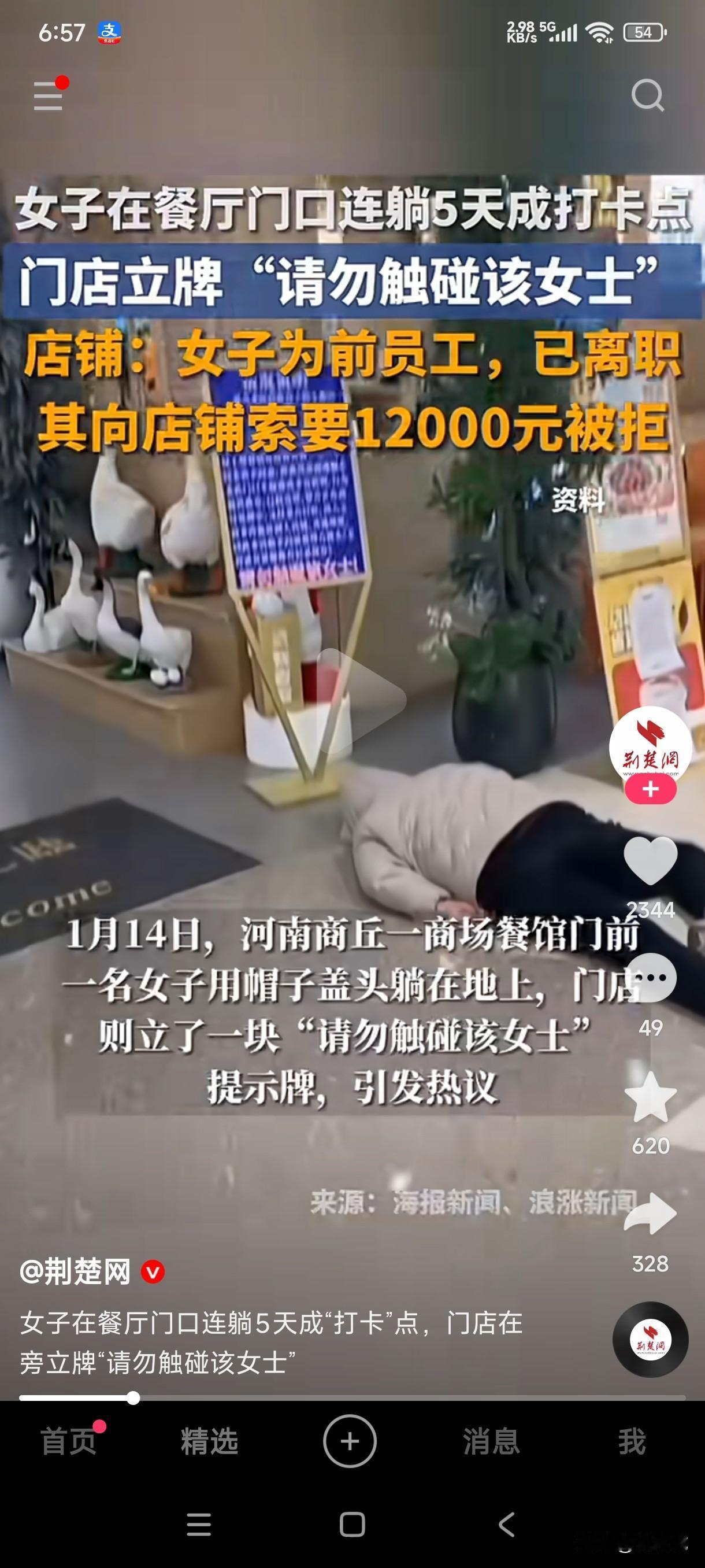河南商丘一商场餐馆门前女子用帽子盖头连躺地上5天,女子是店里前员工,离职后向店铺索要12000元被拒绝。 这种没脸没皮的无赖是不是应该直接给拉到殡仪馆去?仅仅干了几天活,并且离职时也结清了工资,这不知为什么还要向店家索要12000元,这要钱的想法没有得逞,于是就躺在人家店门前耍无赖,而且一躺就是5天时间,店家无奈之下在门口立了一块牌子,请勿触碰该女士,并且还说明了这女子躺在店门口的原由。 这种人你说她不要脸吧,躺地上还知道用帽子把自己的脸盖住,害怕熟人看到了丢脸,你说她要脸吧,她却躺在人家店门口连续5天,不知道她张口就要12000是什么目的?难不成她一直就是这样以讹人的方式赚钱的?