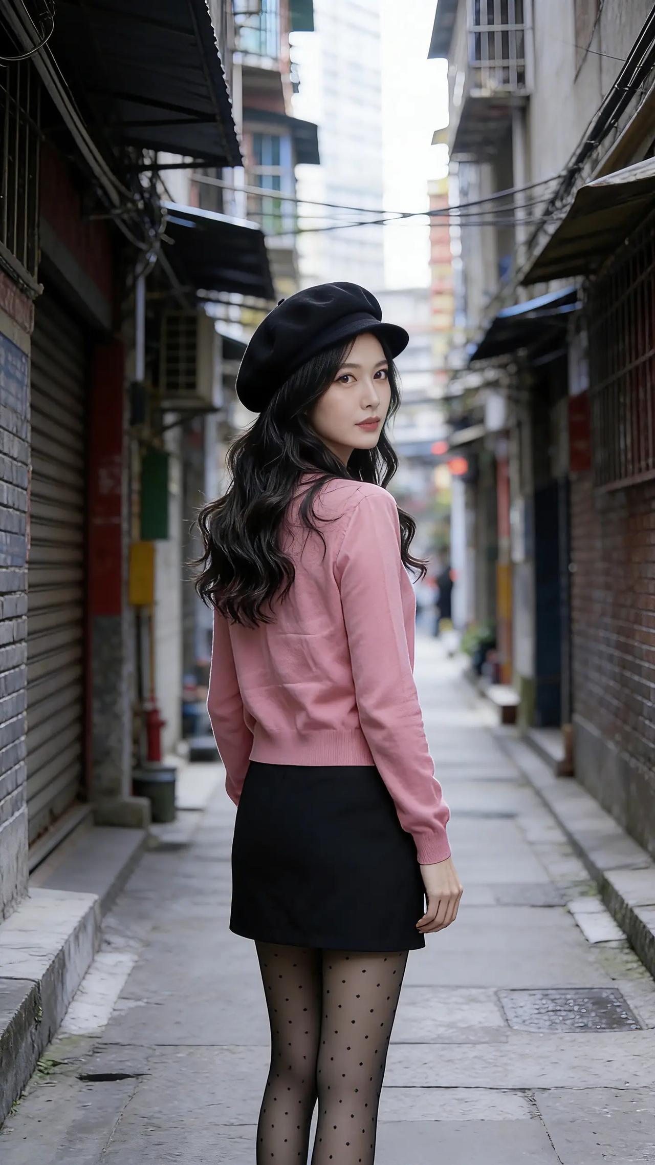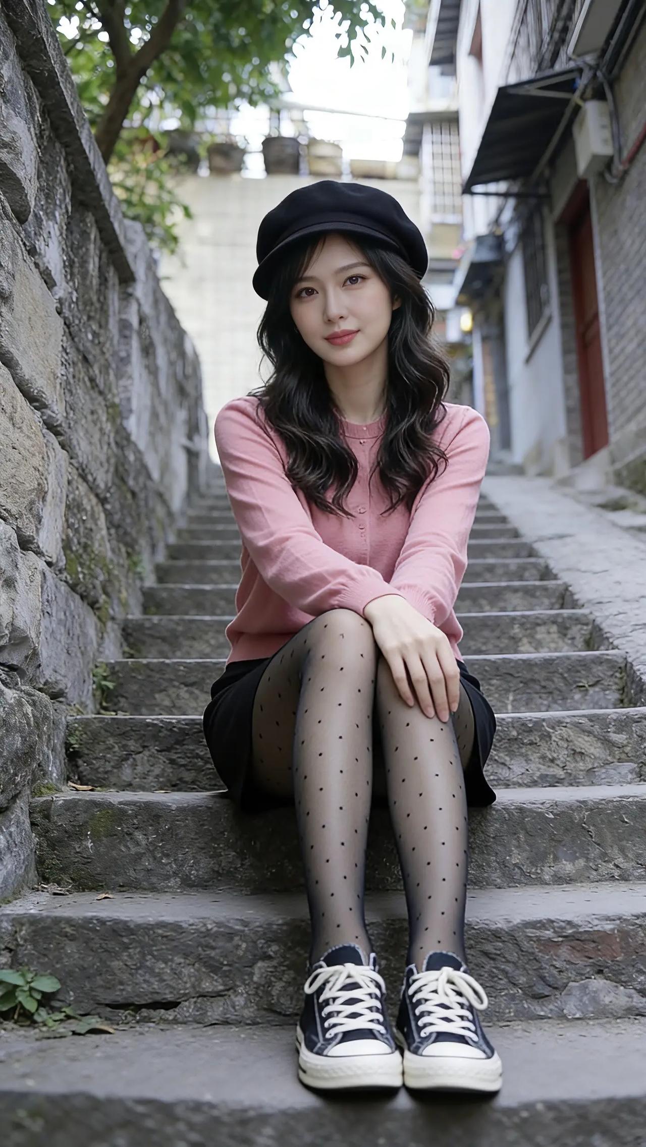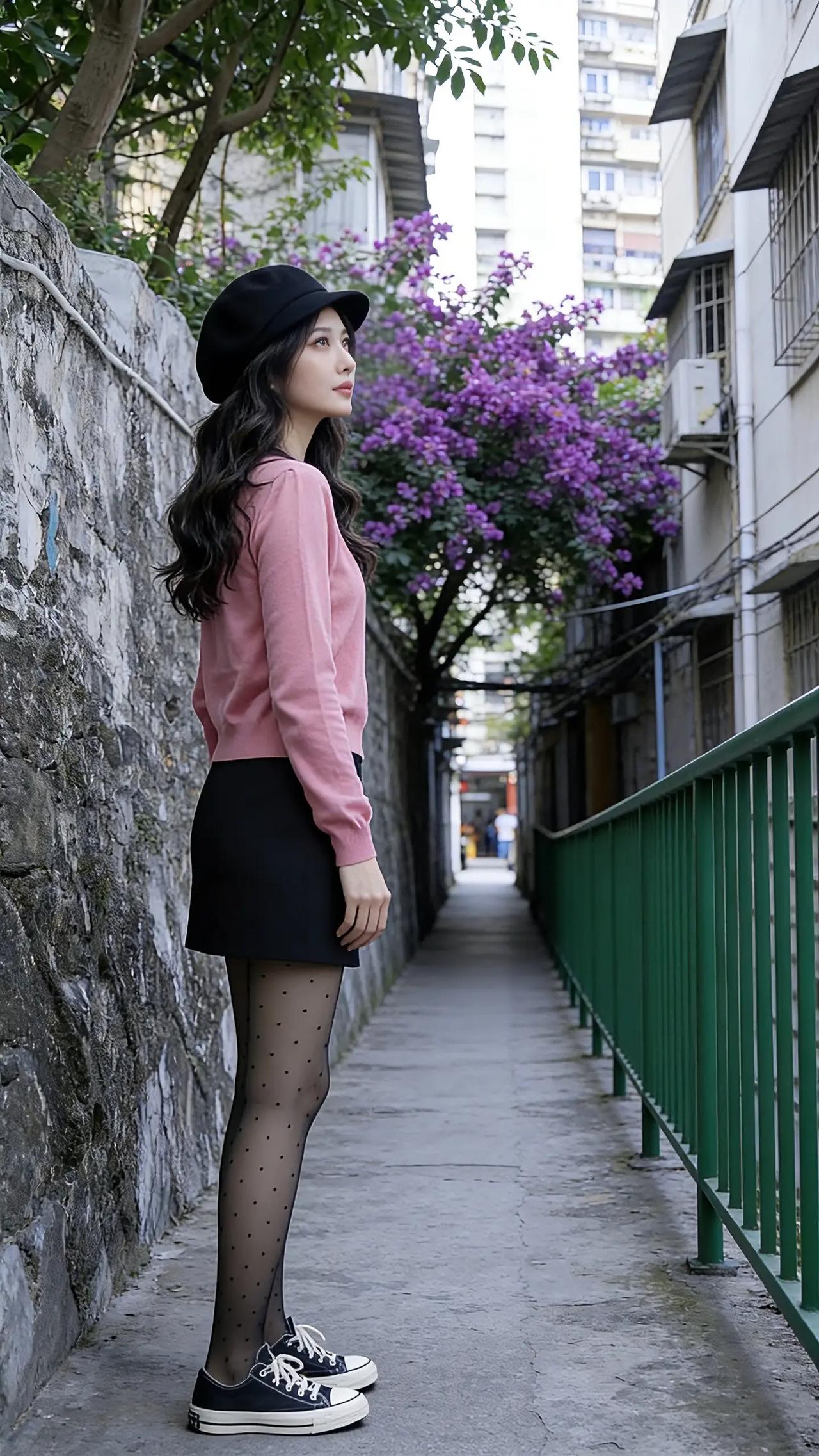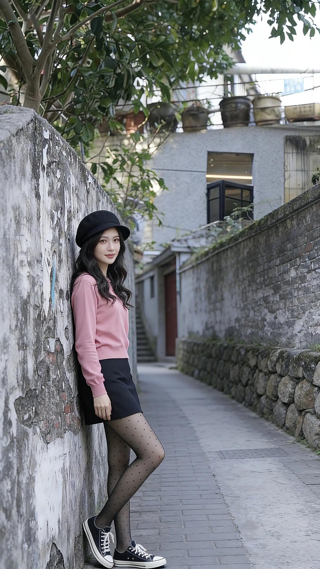 粉衣少女踏青石,黑帽轻扬步履轻。