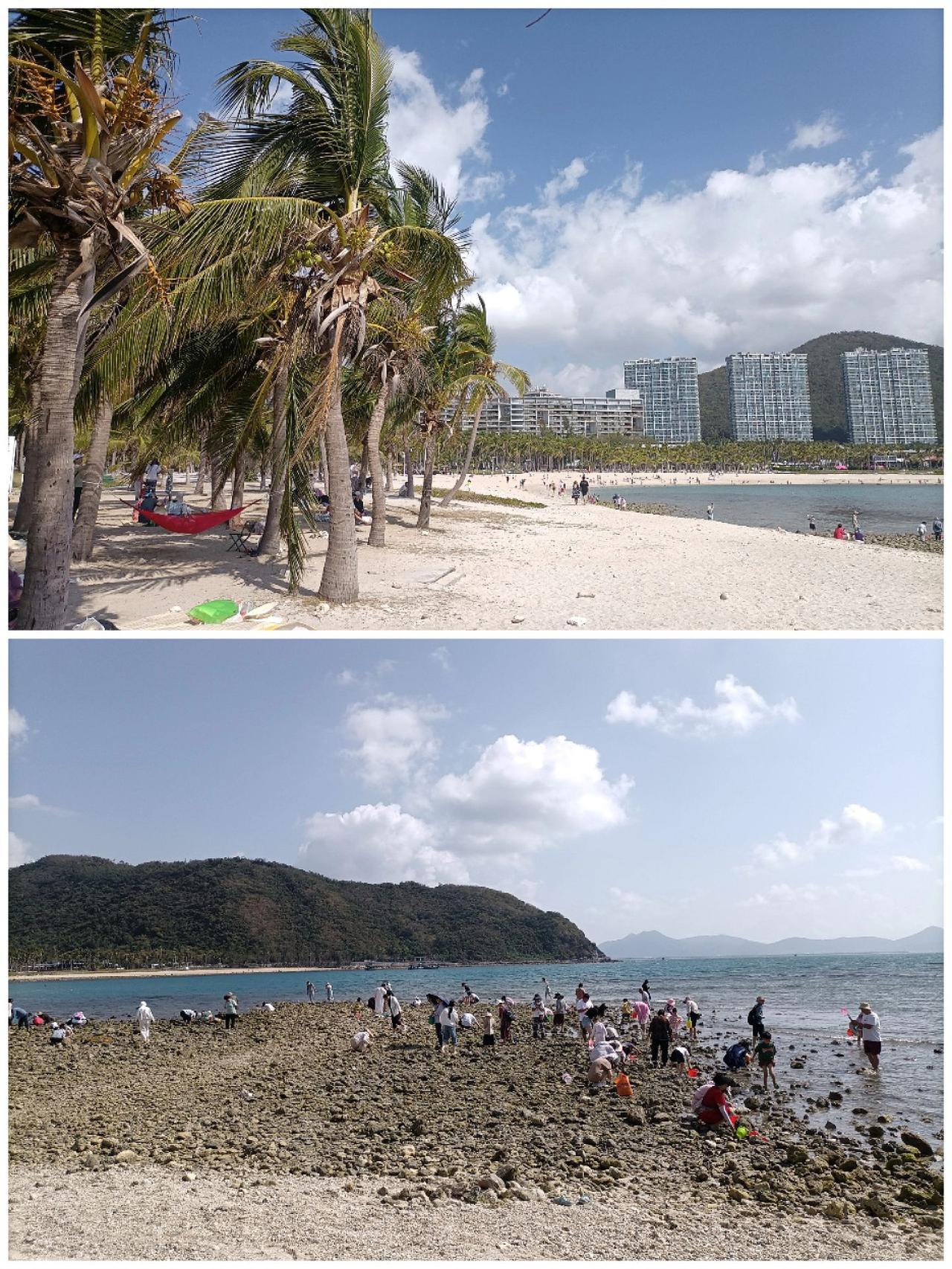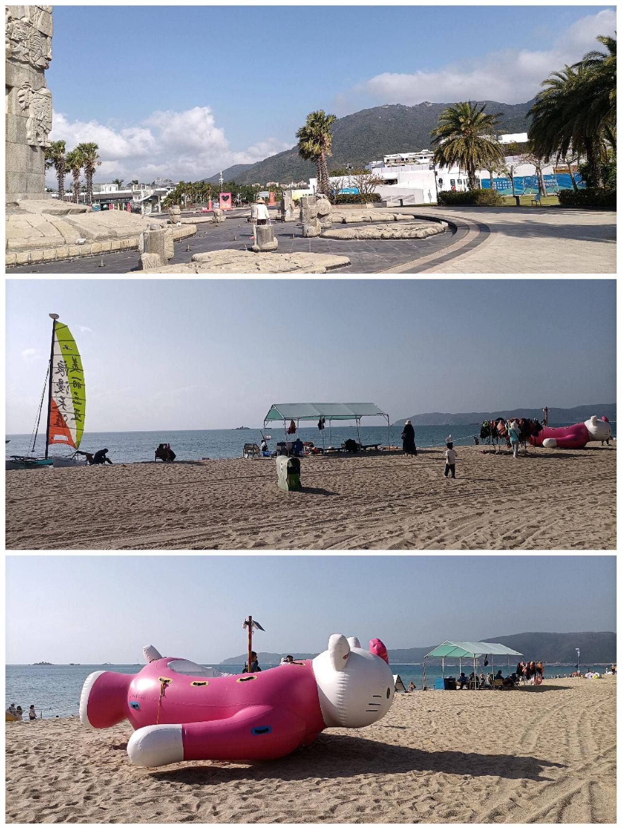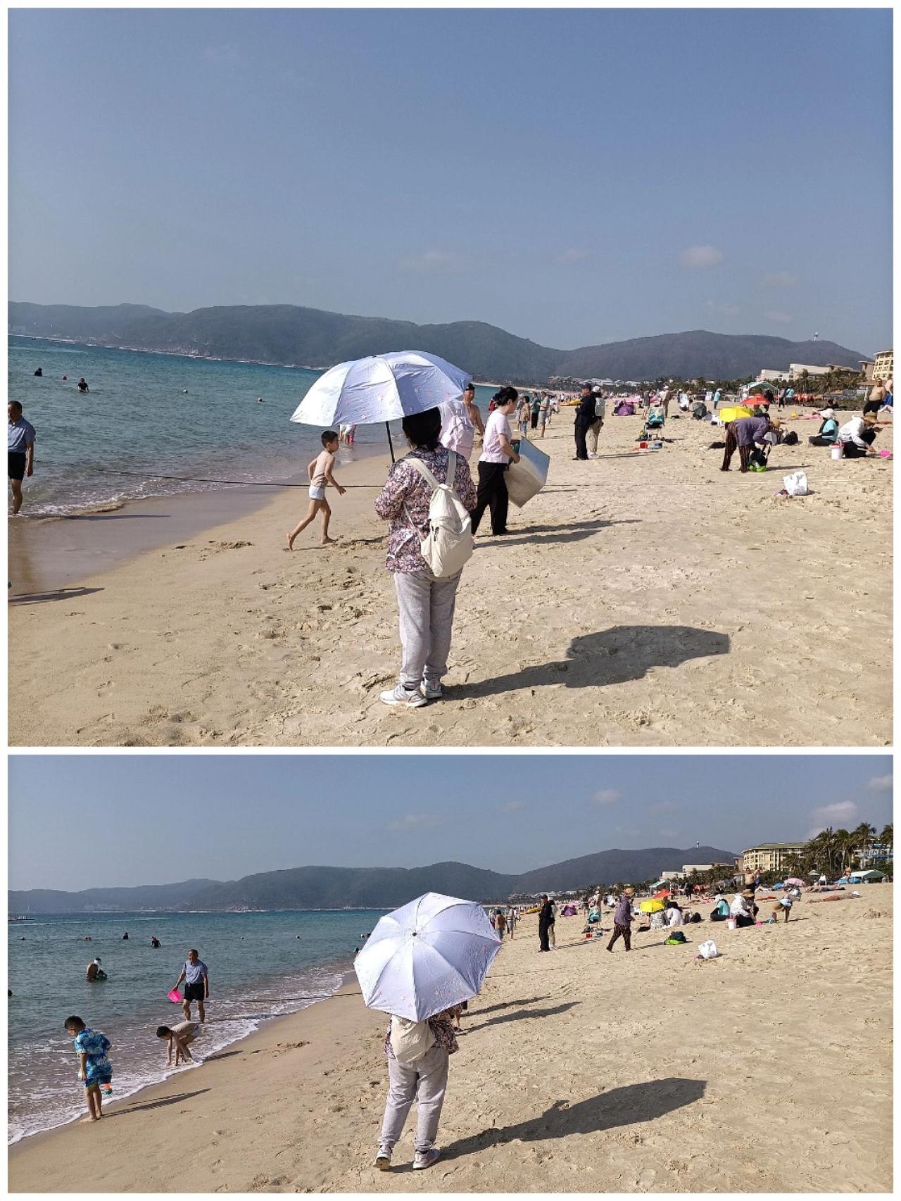 海南第一湾,亚龙湾海滩,进门处的图腾立柱和前景(图1-2),群山环绕着湛蓝的海湾,远方的帆船、帐篷和躺卧的 kitty猫(图3),在湛蓝的天海一线映衬下,格外的宁静和瑰丽。海浪退潮留下的摩托艇静静地躺在沙滩上(图4),风景如画。海滩上熙熙攘攘,很多人在捡着海石和贝壳(图5-6)。 听说小东海海滩(图7-9),是三亚必去的好玩之地,海湾不大,但风景秀丽,一堆堆的人们正在抓着小蟹小虾;我们也抓了几只小小的寄居蟹,寄居蟹太好玩了,背着螺壳伸着小蟹脚,爬起来速度飞快;我们把五六只寄居蟹养在小水瓶里都送给了小朋友。 海南 三亚 亚龙湾 海