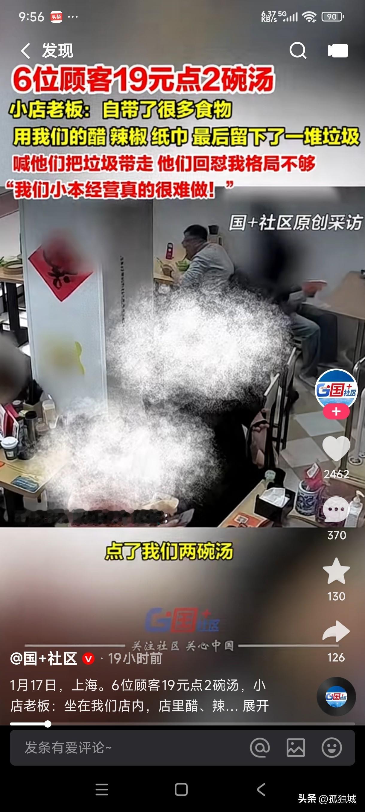上海一饭店6位顾客19元点2碗汤,他们自带很多食物,用了店里的辣椒醋纸巾,临走时留下一堆垃圾,店家喊他们把垃圾带走,他们回怼店家格局不够大! 这种情况到底该定义谁的做法是错的?6个人花19元点了两碗汤,用自己带的食物用了店里的辣椒醋,纸巾,而且还造了一堆垃圾,店家可能觉得是亏了,心里难免会不舒服,所以在他们走的时候让他们把垃圾带走这也没什么毛病,但他们反而没有带走垃圾还把店家怼了一顿,说店家没有格局。 站在爱占便宜蛮不讲理的人角度上来说,这无疑是店家格局小了,但站在做小买卖营生的人角度上来说,这帮人确实做法不妥,他们可能觉得自己花钱了就为所欲为,但他们6个人花了19元,他们以为自己花的可能是美元,所以才那么横吧? 如果人人都像这6位顾客一样,那大街小巷干餐饮的人还有活路吗?是不是都赔的裤衩都没了?