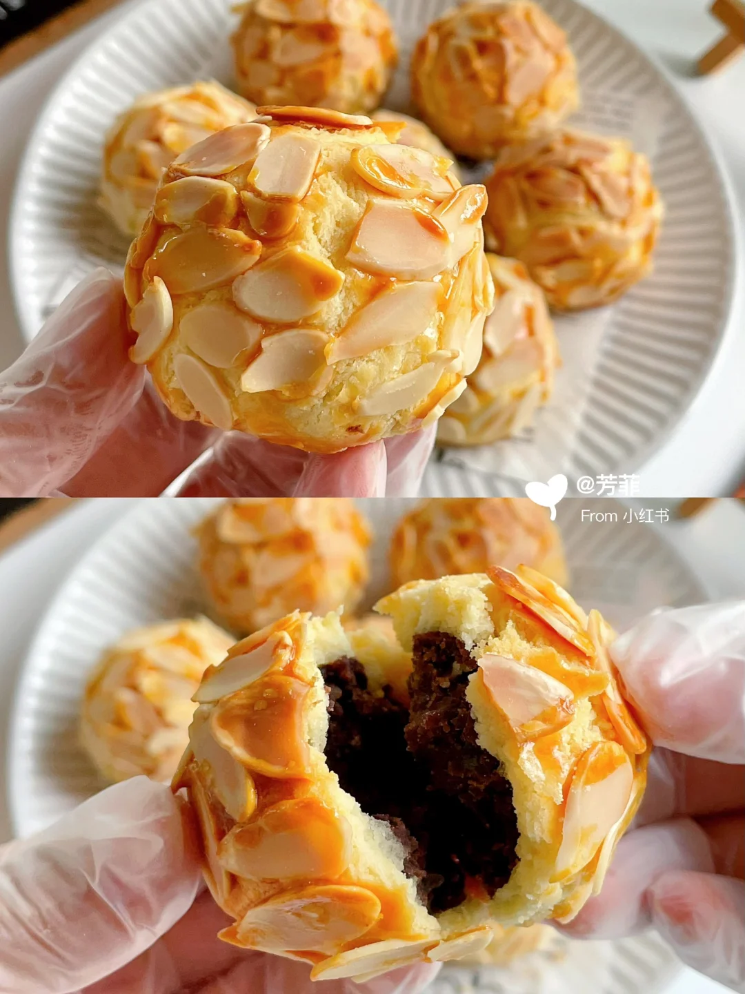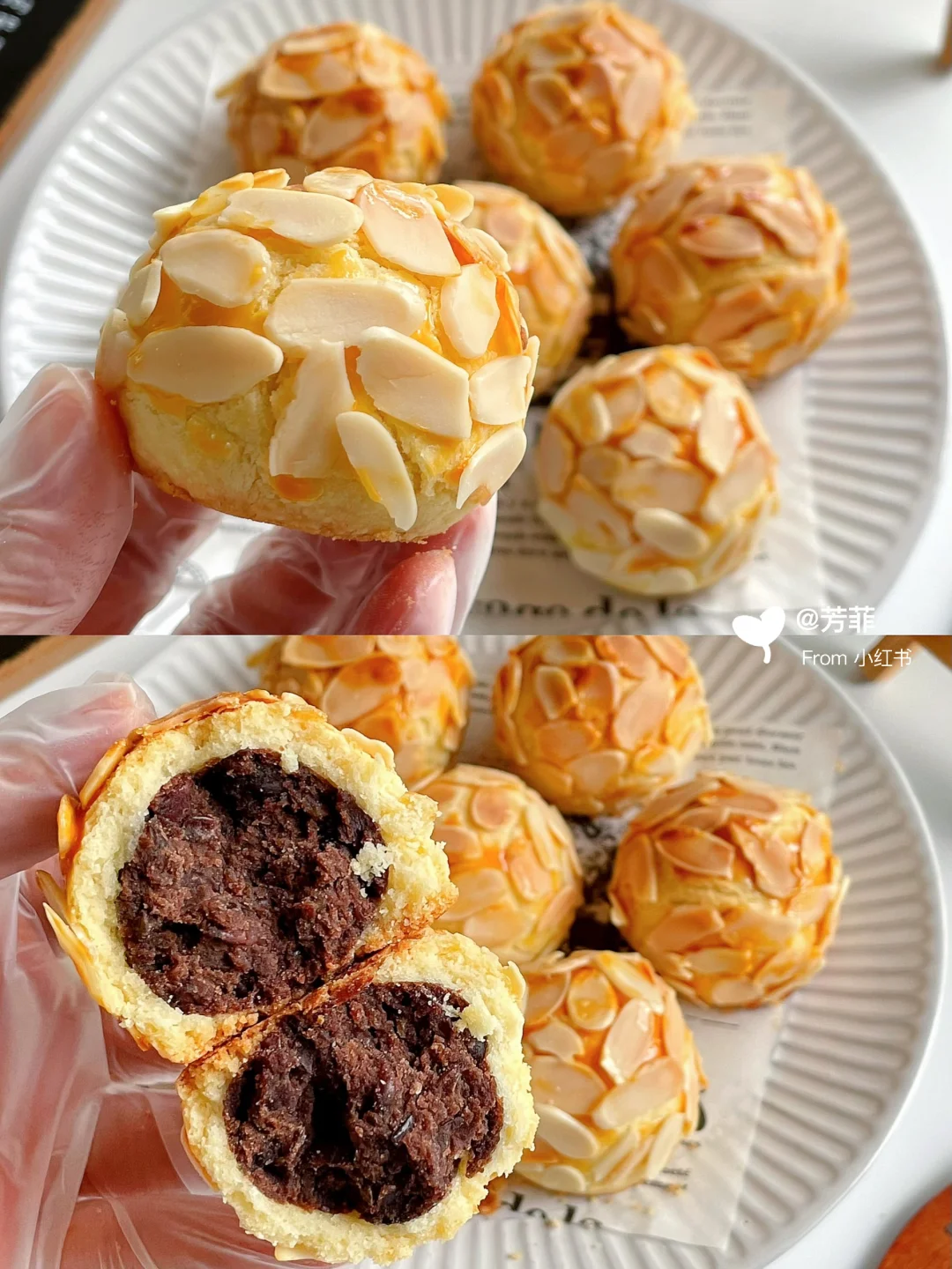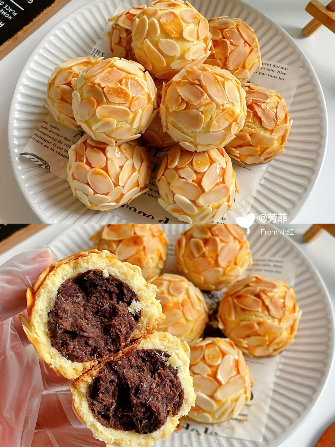 ♨️♨️烤好的杏仁酥香迷糊了,酥脆的杏仁片和奶香酥皮还有香甜红豆馅的搭配,一口下去绝了!巨巨好吃👯快做起来吧