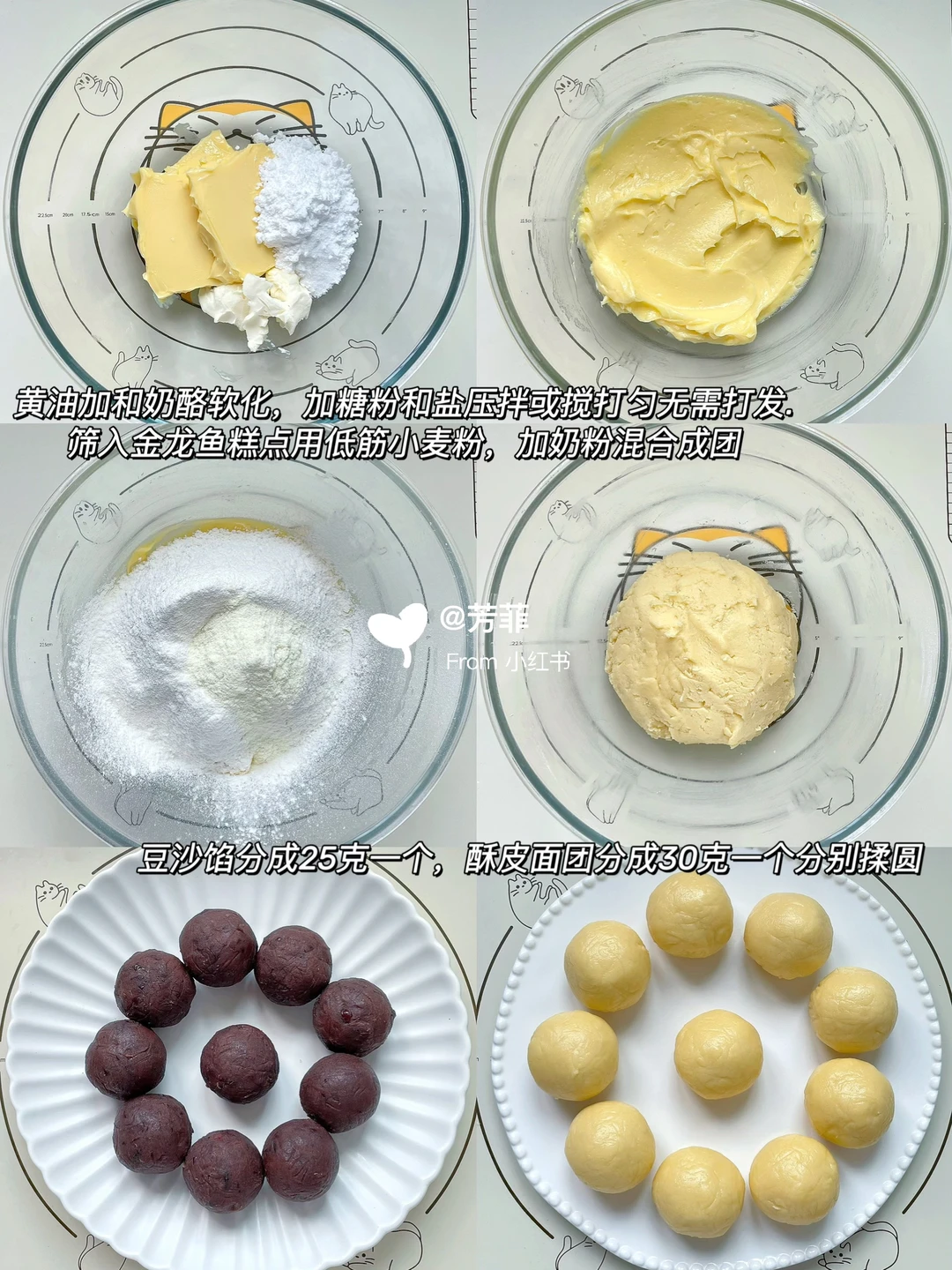 1️⃣准备好食材,红豆馅是早一天泡好红豆,隔天加适量水按煮饭键煮熟.倒入不粘锅加红糖、奶粉、黄油压拌混合匀,先大火不停翻拌收干水分,再转中小火炒至.晾凉备用