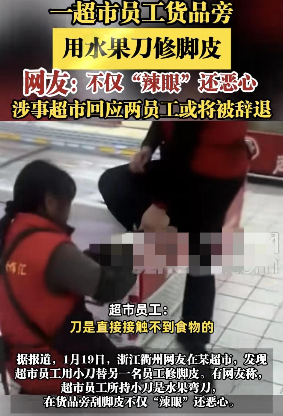 浙江有网友发视频称在超市遇见两名员工居然用削水果的弯刀来削脚皮,感觉到场面特别的恶心,还担心买回去的食物会有细菌感染,超市工作人员回应倒是接触不到水果或者食物的只是用来消除菜的根部。当然员工的做法是不妥的,已经对两名员工进行辞退。
