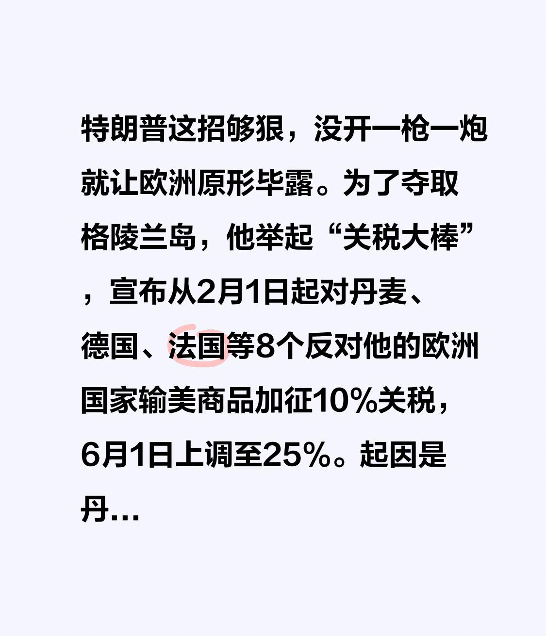 特朗普这招够狠,没开一枪一炮就让欧洲原形毕露。为了夺取格陵兰岛,他举起“关税大棒”,宣布从2月1日起对丹麦、德国、法国等8个反对他的欧洲国家输美商品加征10%关税,6月1日上调至25%。起因是丹麦加强在格陵兰岛演训,英法等国响应派兵。特朗普此举就是要逐个击破,扫清“占岛”障碍。 还有,西班牙媒体指出,短短半年特朗普就让欧洲弱点尽显。欧洲虽谈“战略自主”,但在诸多国际事务中缺乏影响力,对美国安全依赖严重,特朗普不过是利用了欧洲的衰弱。不得不说,特朗普这手段真把欧洲的底给掀了。