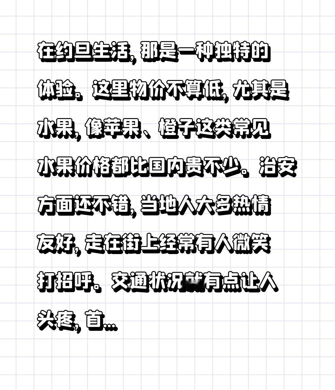 在约旦生活,那是一种独特的体验。这里物价不算低,尤其是水果,像苹果、橙子这类常见水果价格都比国内贵不少。 治安方面还不错,当地人大多热情友好,走在街上经常有人微笑打招呼。交通状况就有点让人头疼,首都安曼道路狭窄,车辆又多,堵车是家常便饭。 宗教氛围浓厚,清真寺随处可见,每天定时会传来悠扬的诵经声。饮食上,以阿拉伯餐为主,馕饼、烤肉、鹰嘴豆泥是常见美食,不过口味偏咸偏油。在这里生活,既能感受古老文明的魅力,也得适应一些不太便利的地方。