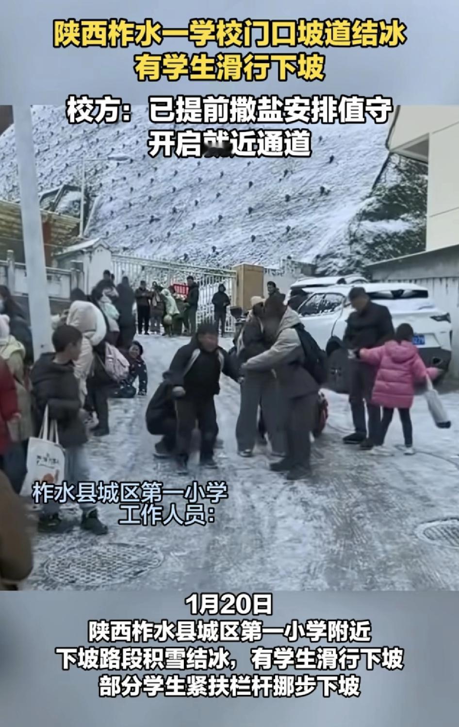 陕西柞水县一小学附近,由于下雪下坡路段积雪结冰,学生上课下课都是滑行下坡。不少学生路过都是紧扶着旁边的栏杆慢慢移动。学校工作人员回应,附近有一个小区学生比较多,目前已经在深夜。和凌晨都安排老师值守,撒上雪盐,并把附近的一个门打开,让学生就近上学。学校也是第1次遇到这样的情况,因为下雪结冰而行走困难的情况。
