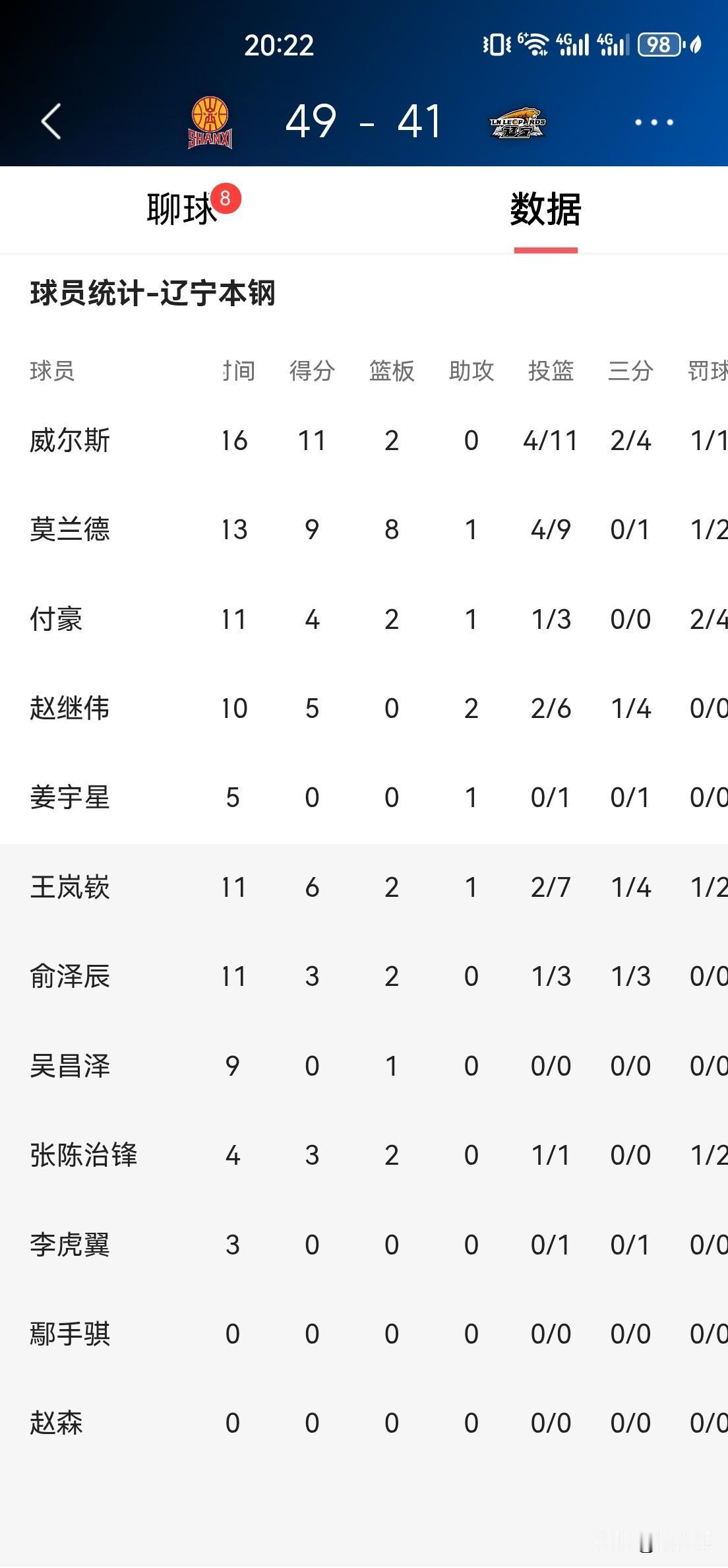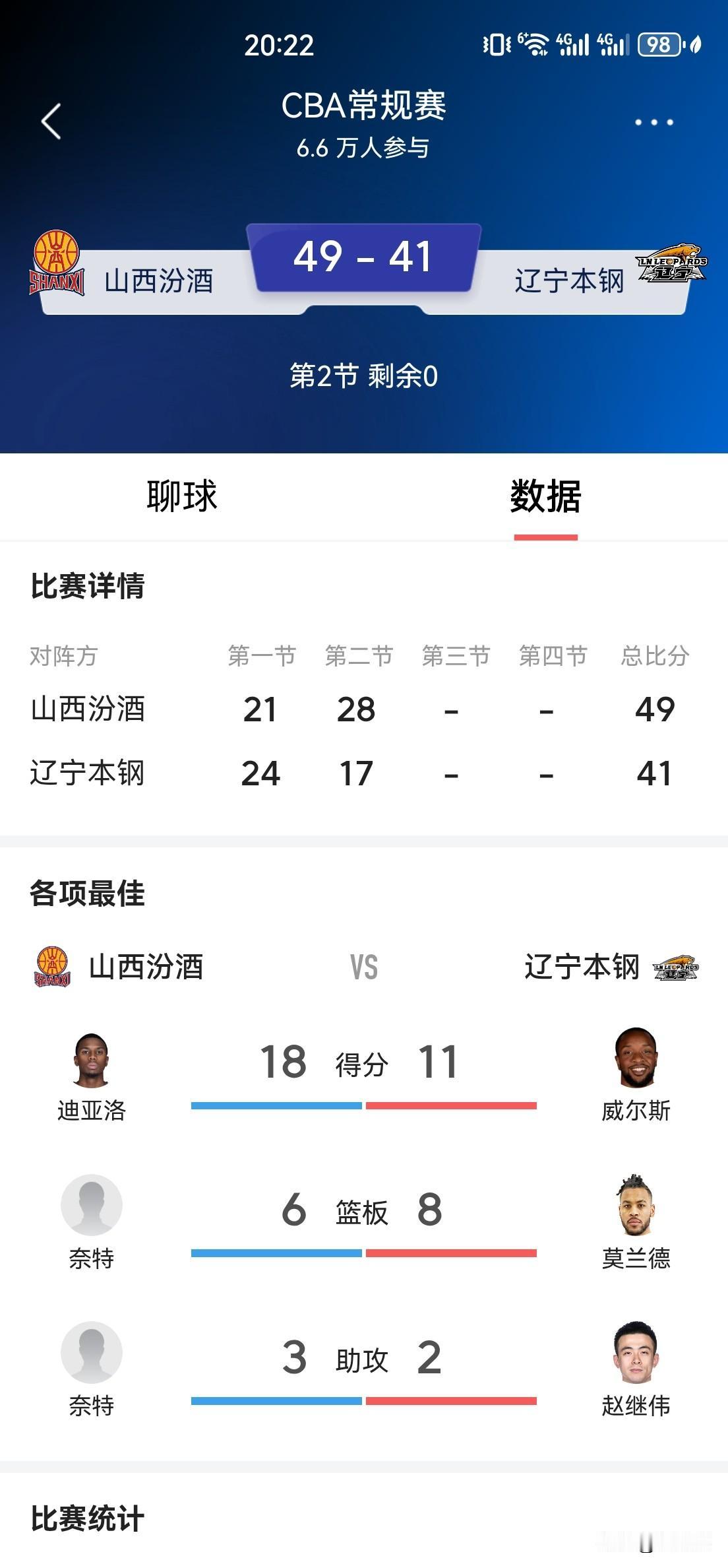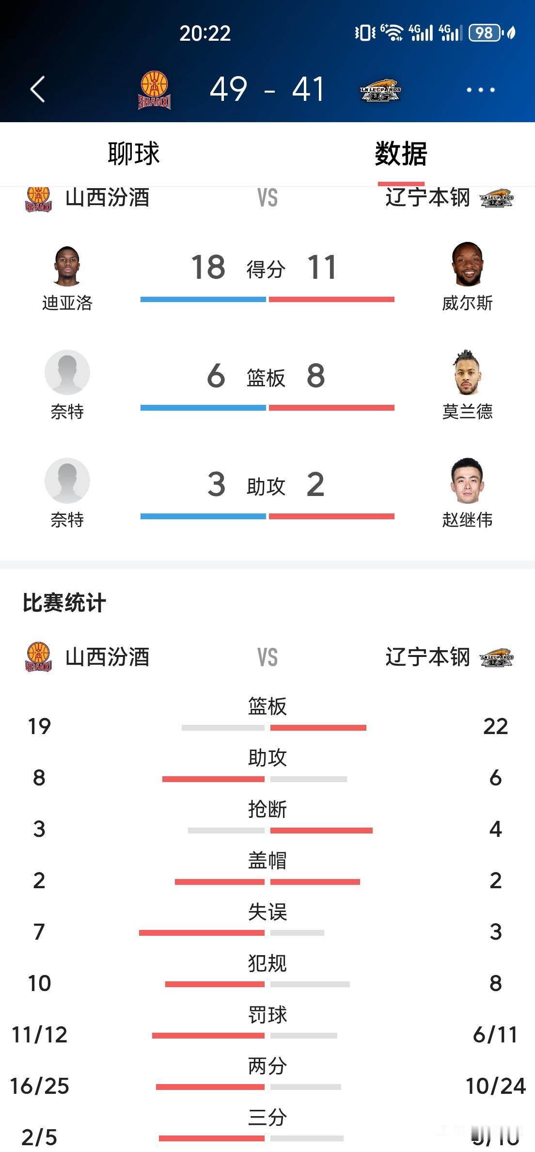 赵继伟、付豪成为防守端漏勺,辽宁难从山西“魔鬼主场”带走胜利。 半场结束,辽宁41:49落后山西8分。赵继伟出场10分钟,6投2中,仅得5分0篮板2助攻,正负值-13;付豪出场11分钟,3投1中,得到4分2篮板1助攻,正负值-10。 首节比赛辽宁队依靠良好的三分球手感 24:21领先山西队3分,第二节三分球命中率下降,加上赵继伟、付豪两大防守漏勺同时登场,单节17:28净输11分。