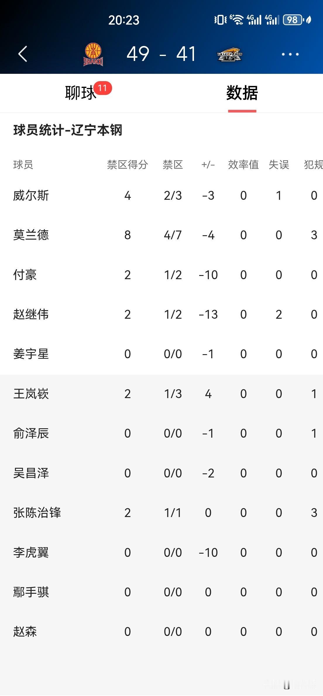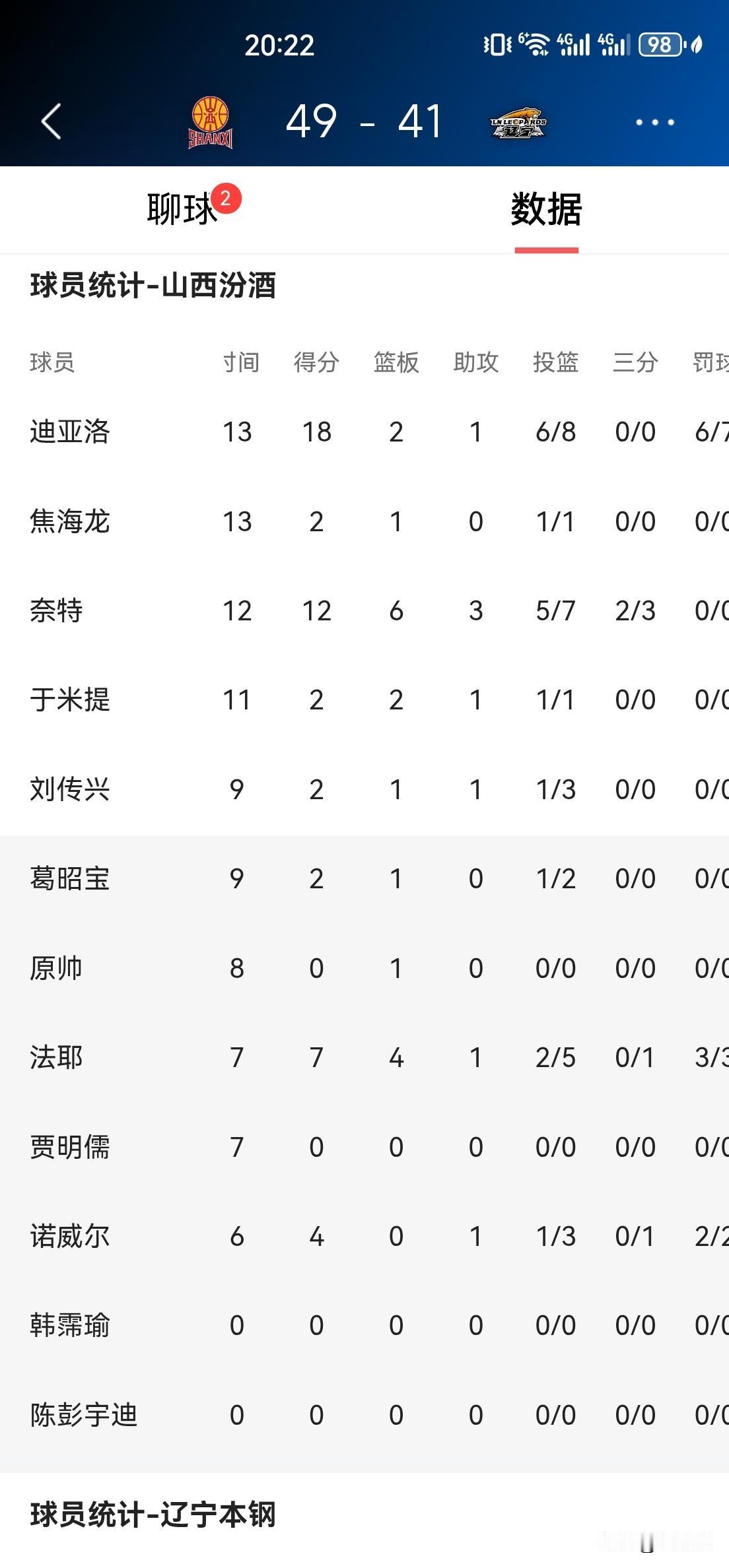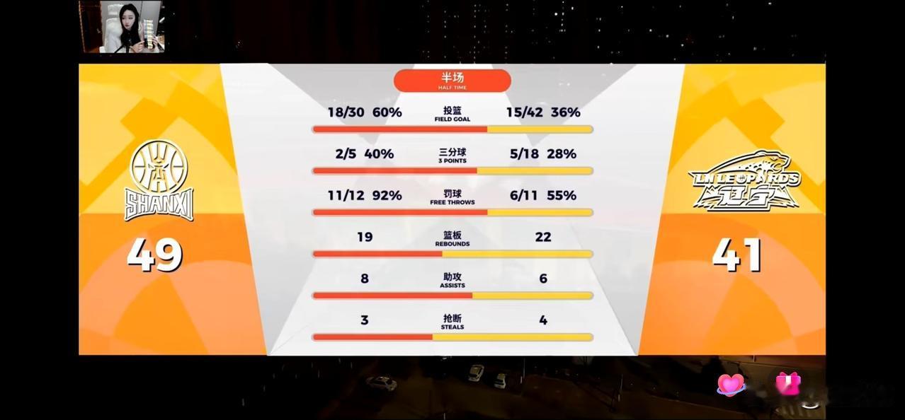 赵继伟、付豪成为防守端漏勺,辽宁难从山西“魔鬼主场”带走胜利。 半场结束,辽宁41:49落后山西8分。赵继伟出场10分钟,6投2中,仅得5分0篮板2助攻,正负值-13;付豪出场11分钟,3投1中,得到4分2篮板1助攻,正负值-10。 首节比赛辽宁队依靠良好的三分球手感 24:21领先山西队3分,第二节三分球命中率下降,加上赵继伟、付豪两大防守漏勺同时登场,单节17:28净输11分。